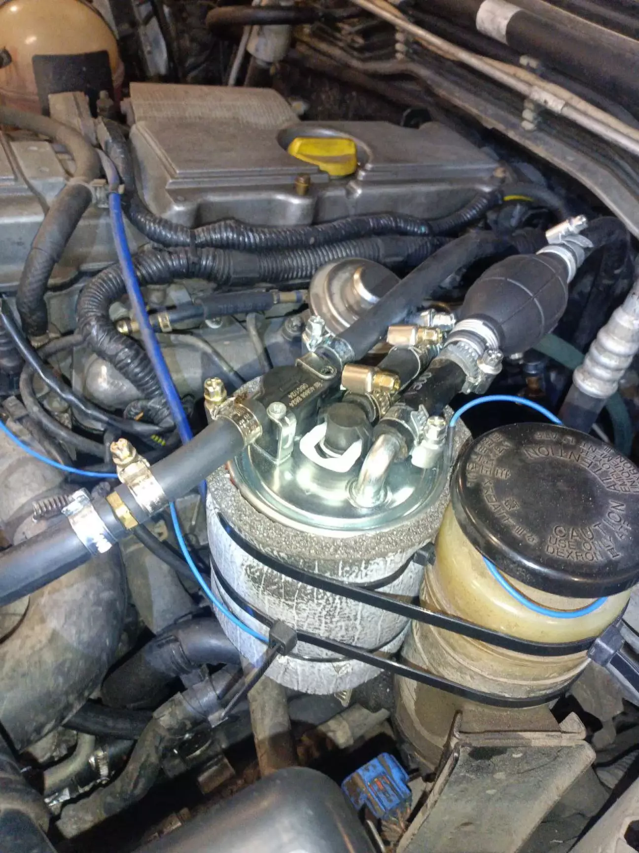 Що було зроблено? Все на фото, фільтр від Спрінтоса + зворотній термоклапан + штуцер виходу на ПНВТ (продається комплектом з трубкою, на якій їх 2 🙂), обмотаний карбоновим шнуром (споживання 1А) і вдягнутий в фольгоізол.