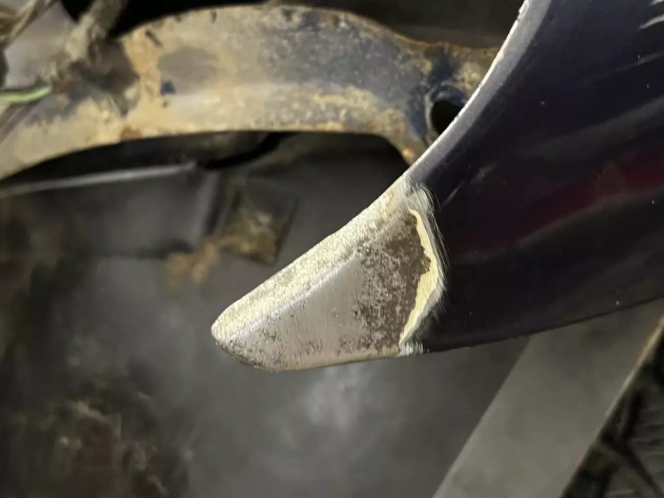 Принаймні метал там є, і трималося воно всупереч моїм очікуванням не на здутій фарбі. Цей кут рихтували післ ДТП і навалили туди шпакла, під яким все почало гнити. Ну якщо вони навалили, то чим я гірше?