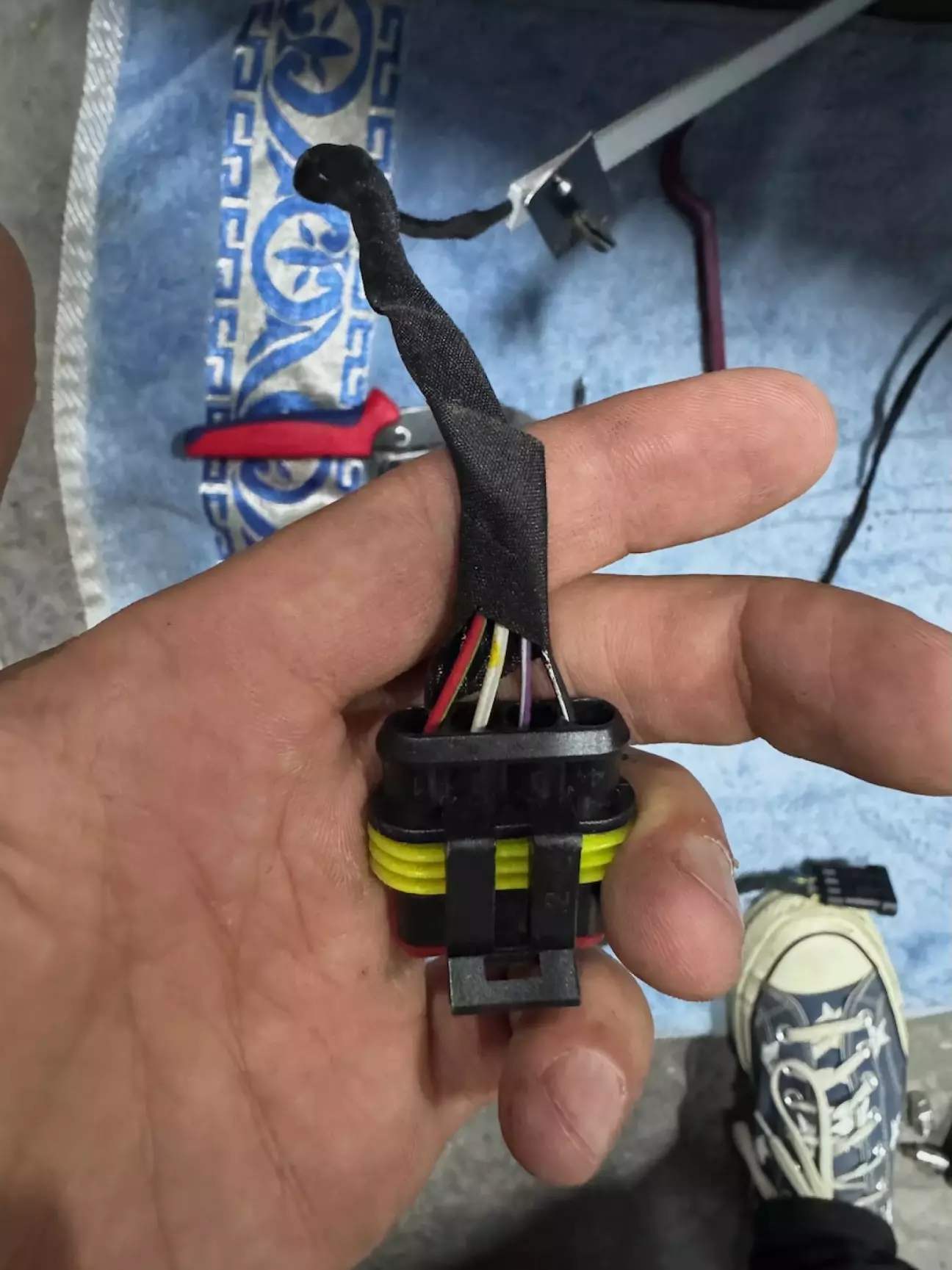 LED контроллер я розмістив за бардачком, в штатній ніші під модуль складного даху. Там же ж і приєднався до живлення в штатному блоку прикурювачів. Для цього довелось добавити додаткові піни, бо вже всі вільні були зайняті попередніми дооснащеннями. Вся проводка йде назовні через штатні гумові прокладки в моторному щиті і в днищі багажника: