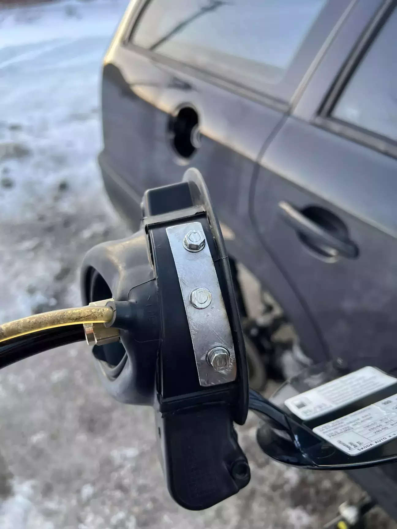 Нічого не підозрюючи знімаю лючок бензобаку, прикидую на око приблизне розташування кроштейну, свердлю отвори, підкидую декілька шайб під кронштейн, так як його площина не ідеально овальної форми, та прикручую болтами. Болтики взяв із нержавіючої сталі під шестигранник, щоб було гарно.