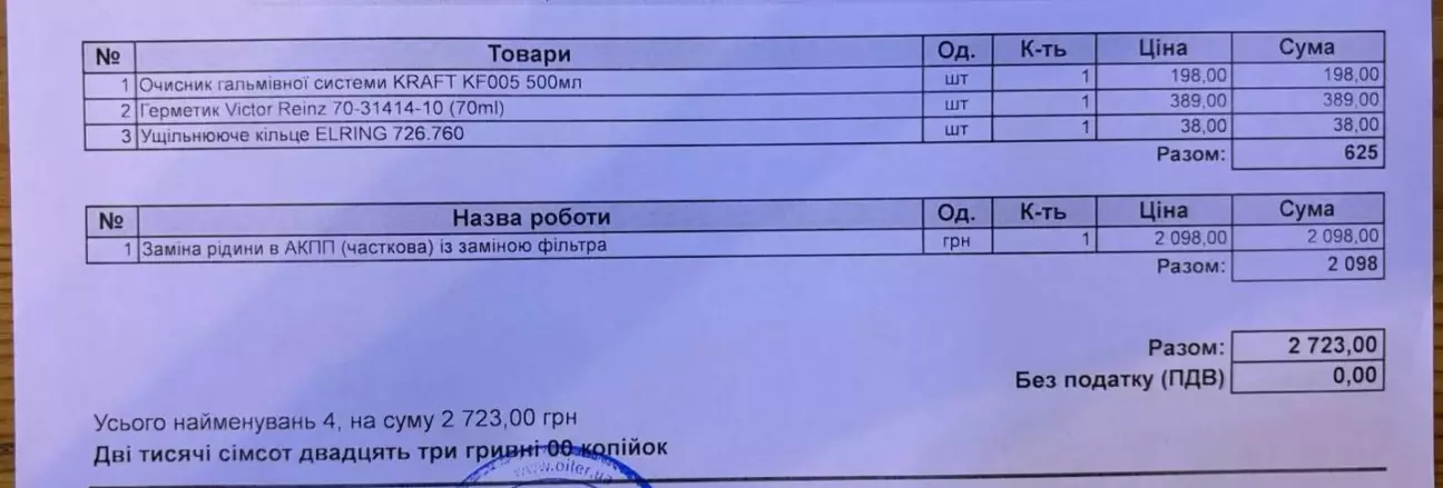 2. Повна заміна оливи в АКПП. Там як олива так і фільтр були включені в вартість, тому і вартість більша.