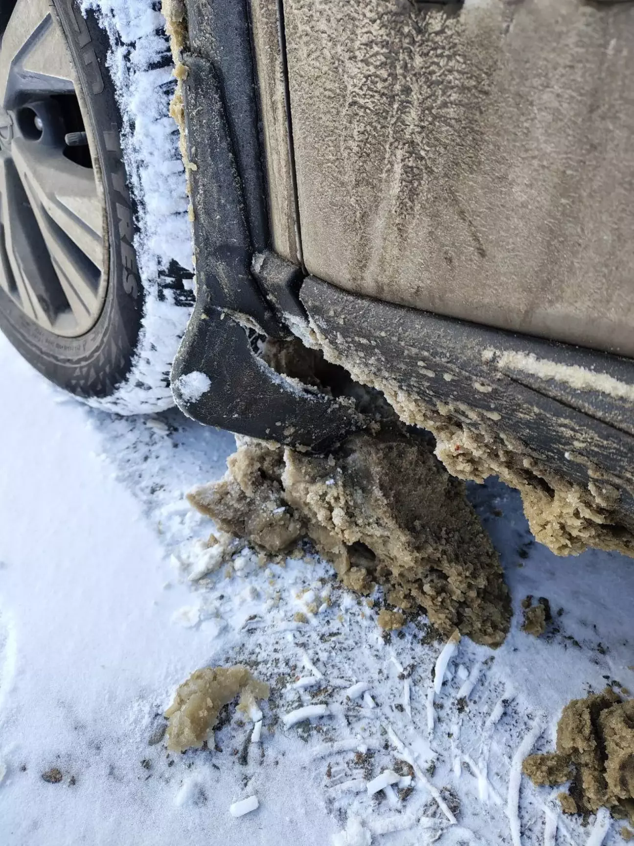 Спочатку трохи про екстремальні умови: десь у січні ми мали плюсову температуру зі снігом і на наступний день одразу мороз. І відповідно, проїхавшись на авто ввечері я назбирав мокрого знігу на арки і бризковики, а наступного ранку на першій нерівності одержав ось таке: