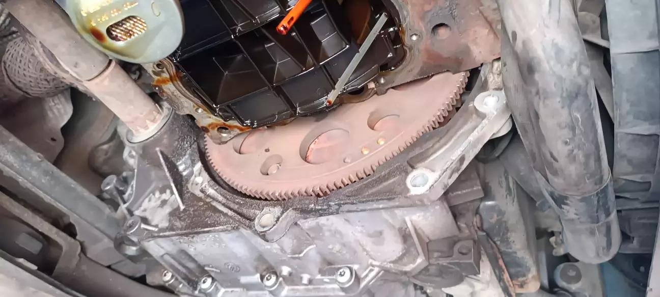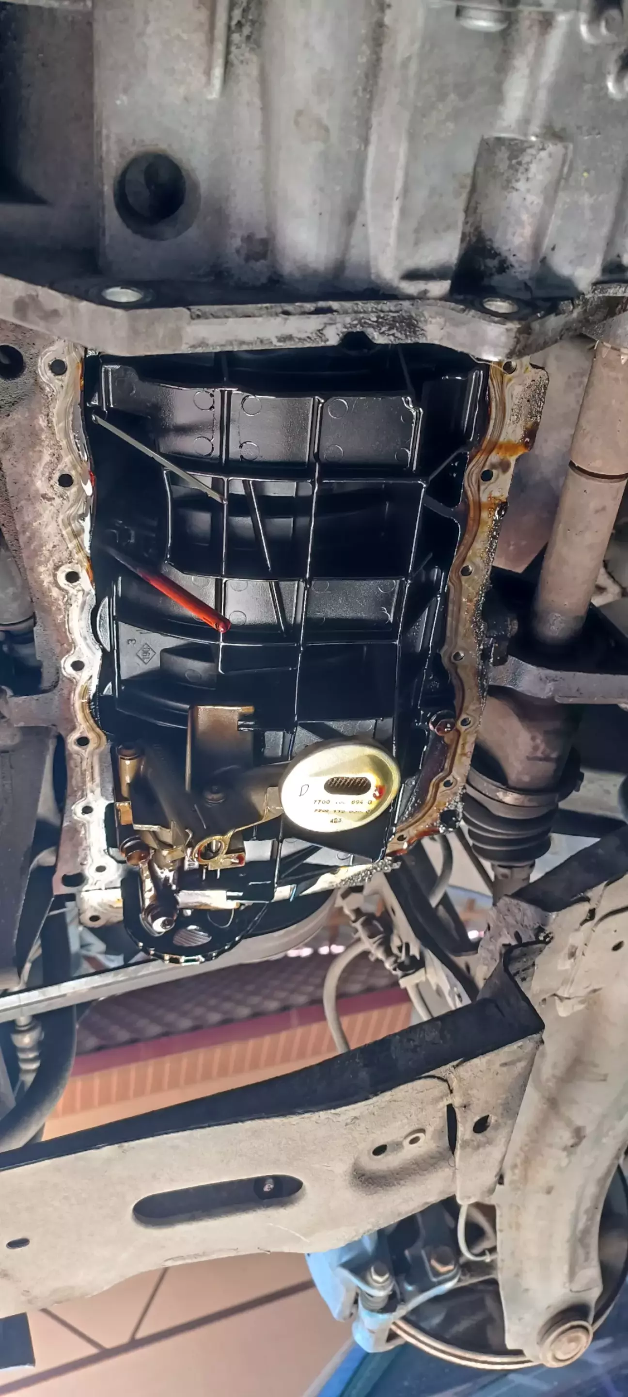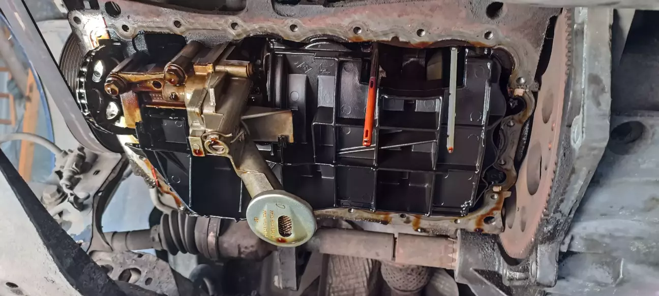 Зняли піддон, стара прокладка задубіла, не пам'ятаю знімали чи пропускали передній підрамник для цього.