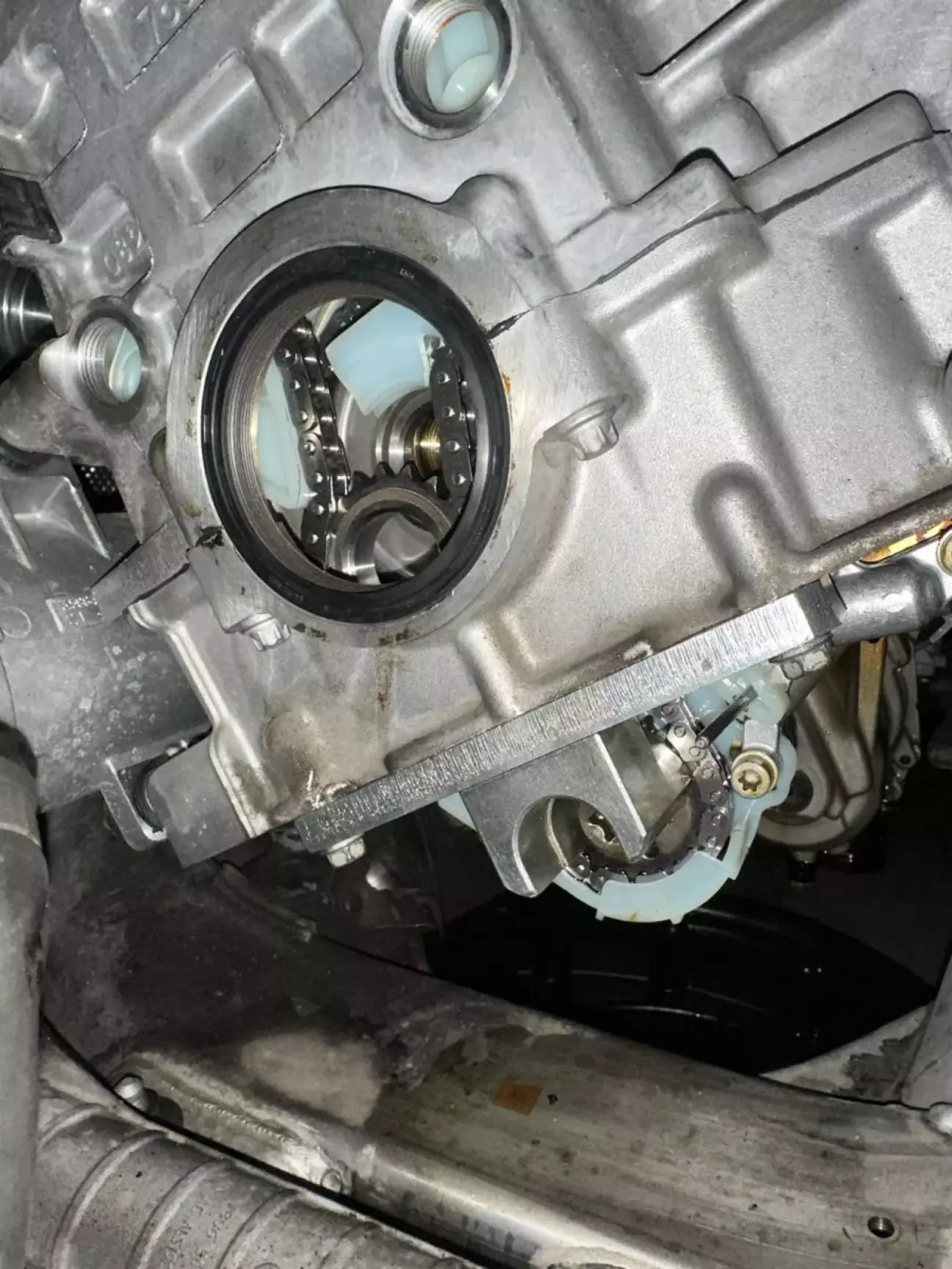 Сам ланцюг виявився у досить хорошому стані, з мінімальним розтягом. А от із пластиком усе було менш оптимістично — направляючі вже почали кришитися, і один невеликий шматочок уже був у маслоприйомнику.