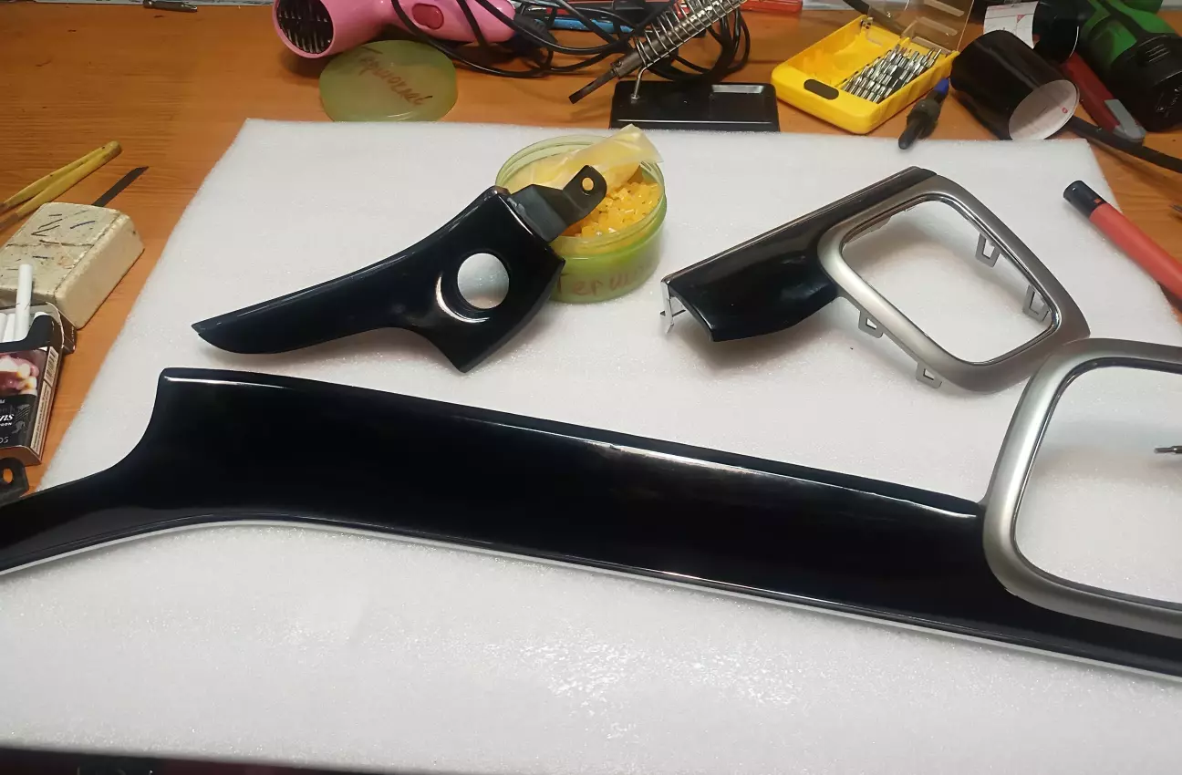 Назад хромовані елементи закріпив термоклеєм який в мене валявся років двадцять. Це такі гранули які плавляться паяльником. Кладеш гранулу, грієш і вона заповнює простір де був висверлений шматок пластика. Тримає на совість.