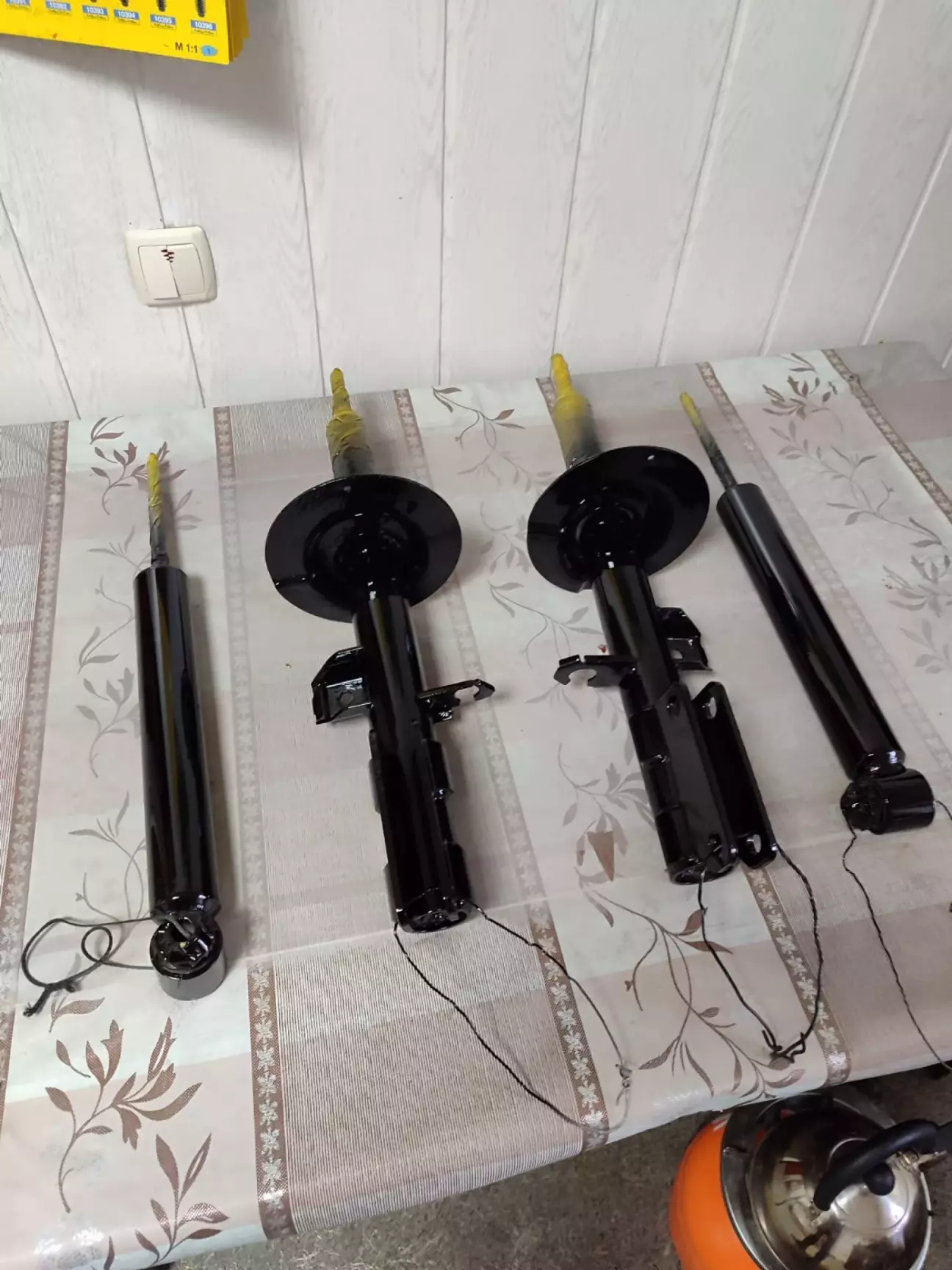 Передние и задние опорники новые заказал, пыльники и отбойники тоже. Стойки решил освежить… из желтого в черный)