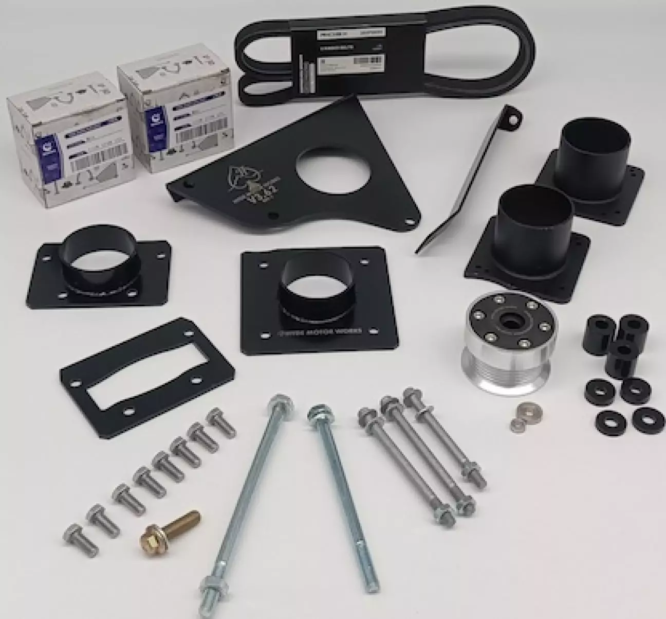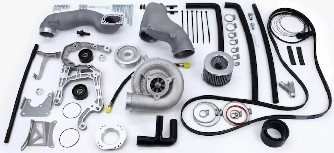 З саморобних кітів більшість використовувала компресори типу ROOTS від компанії EATON. M62 - малий компресор, для 3.0л двигуна його замало. M122 - був на 5.8л двигунах v8 від Ford Mustang. - забагато. Золота середина - M90. Мінус компресорів типу Roots першого покоління - це Дуже низький ККД (Але й низька ціна). Ну і так звані "кіти" від тої ж компанії Hyde під вищезгадані компресори eaton - виглядають жахливо. Просто нарізані лазером пластини кріплення. До повноцінних кітів їм ой як далеко: