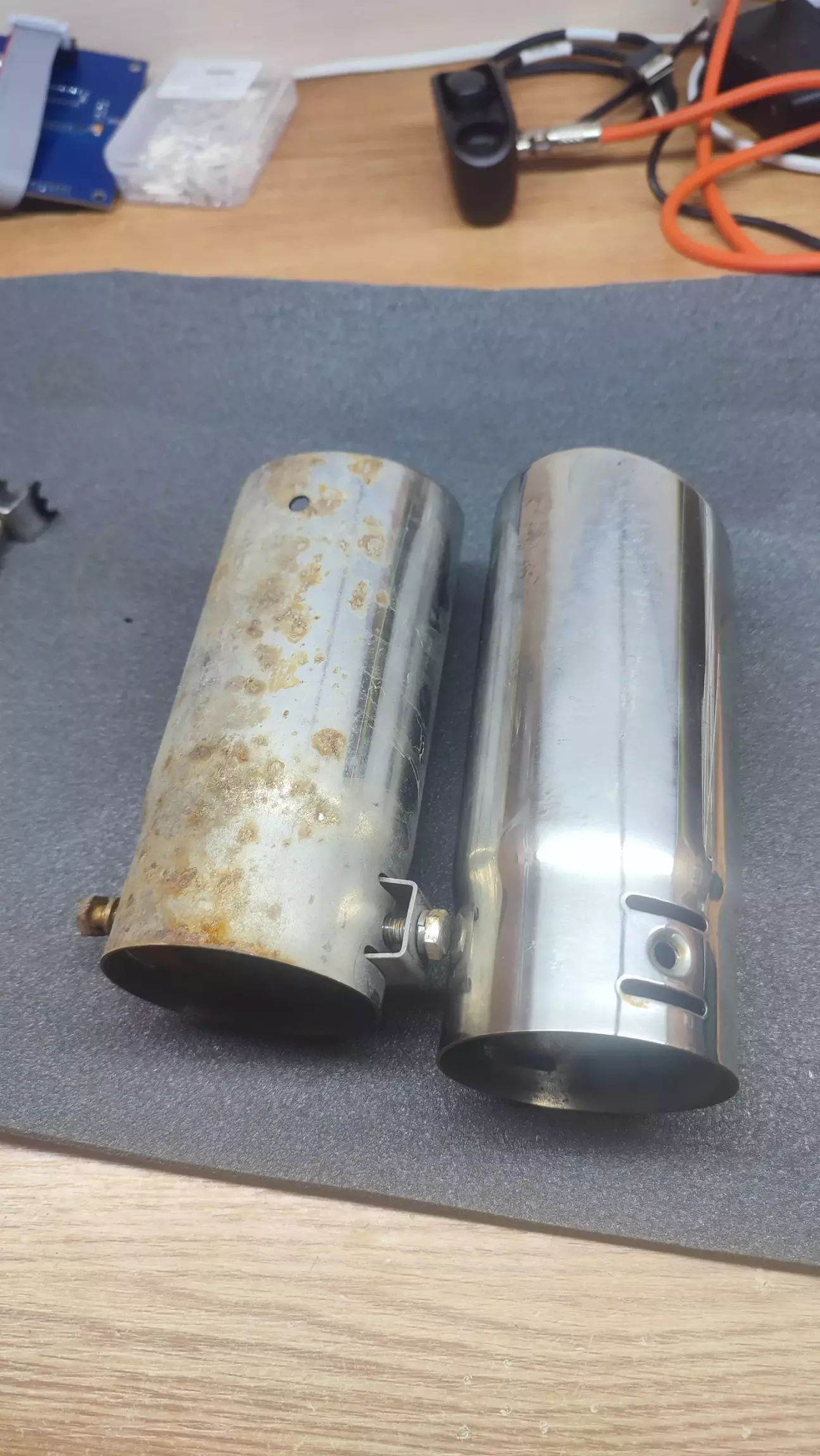 Той мене заспокоїв і каже не плач, якщо насадки хоч трохи нержавійні, то ми все відновимо. Розписав що це не ржавіє сама нержавійка а це утворюються окисли внаслідок високої температури, вологості і реагентів з дороги і є великий шанс їх прибрати. По перше треба відмити насадки під звичайною водою від звичайного бруду і сажі. Також треба старатися кожного разу максимально висушувати метал після кнотакту з водою, щоб в порах не залишалася вода, яка буде провокувати швидке повернення окислів. Після ванни, ретельно витираємо труби, пропшикуємо спиртом чи чимсь вологовиштовхувальним і добре сушимо.. Далі можна або оцтом, або ще краще в лимонній кислоті відмочувати насадки і просто механічно відтерати ганчіркою. Для проби беру оцту на ганчірку і пробую на менш поржавілі трубі...ооо, а воно працює:
