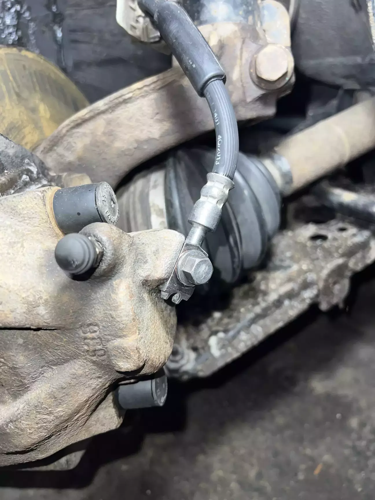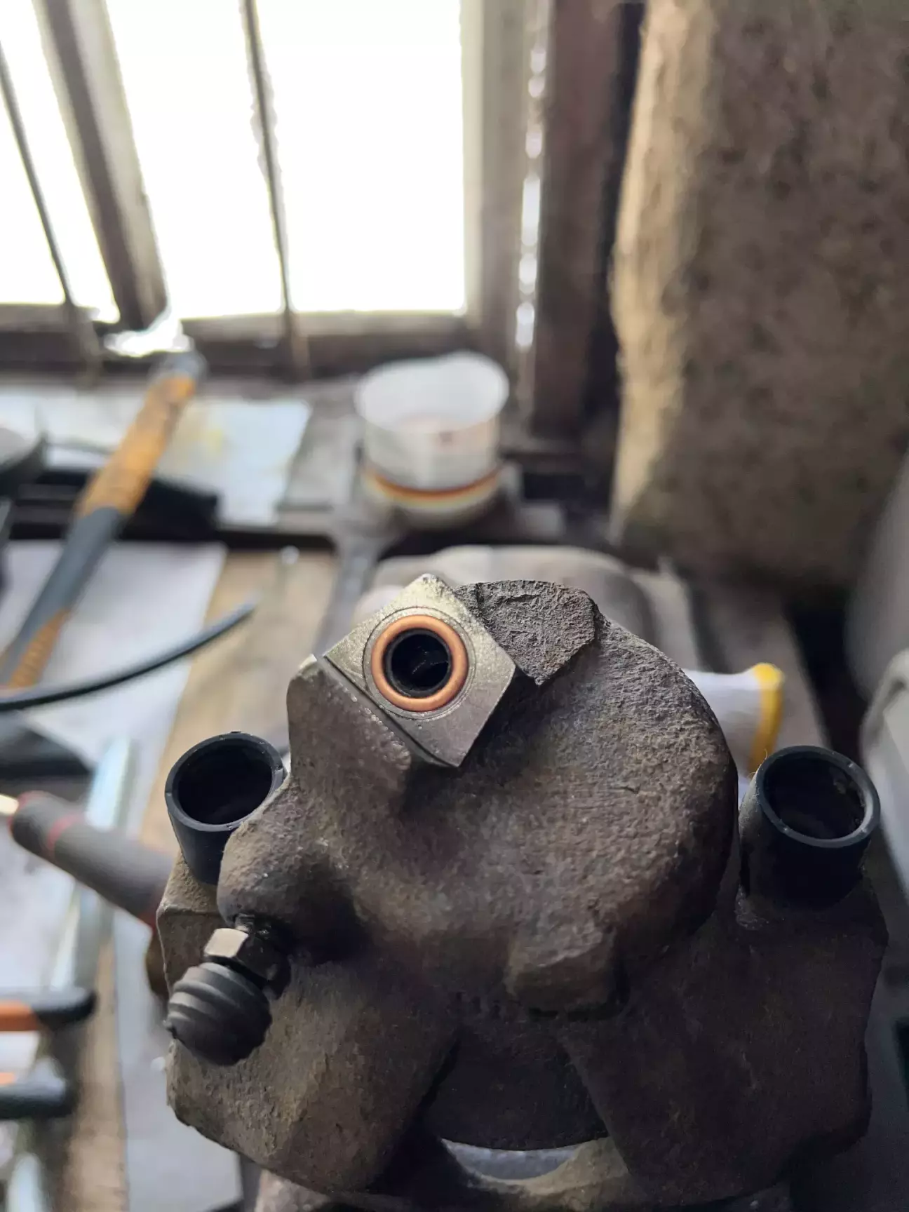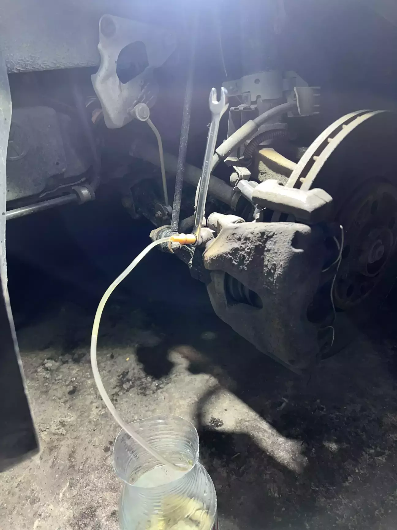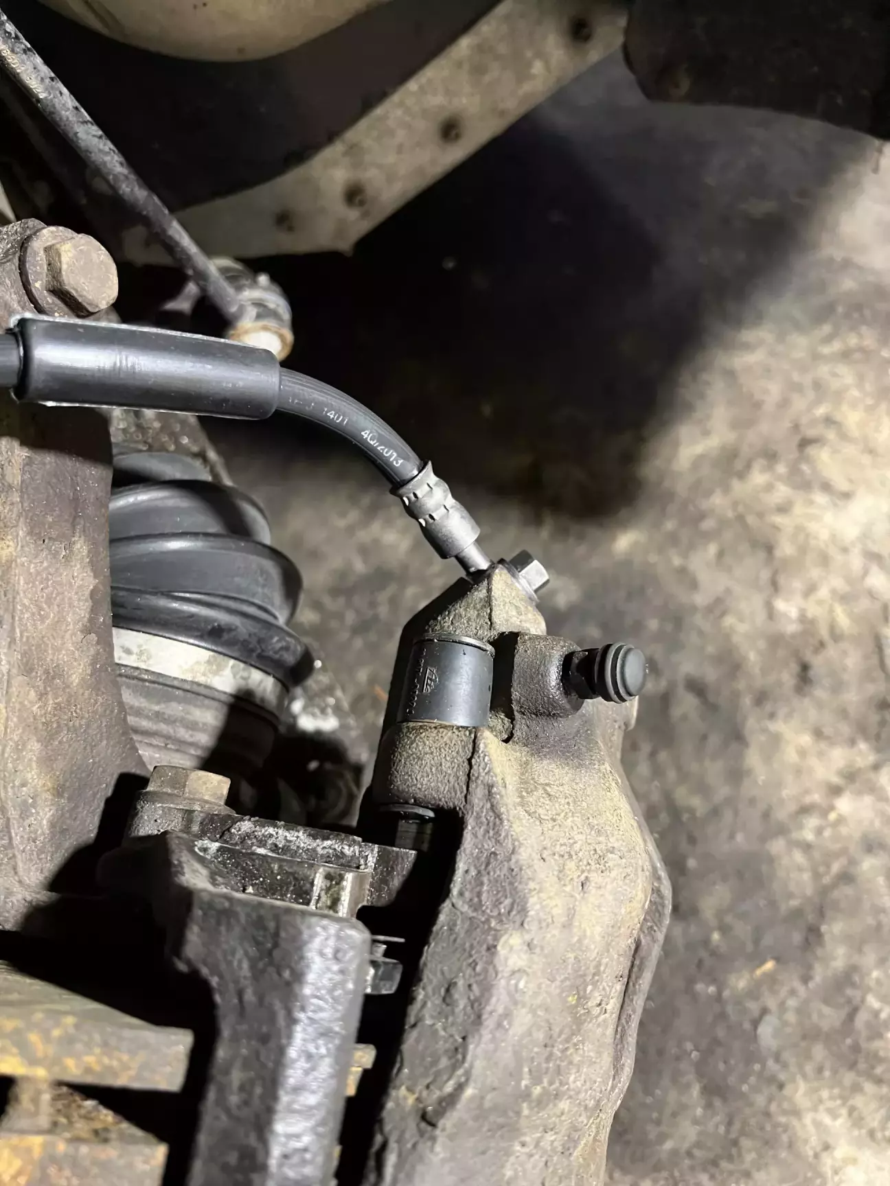 Зняв колесо, почав оглядати і відразу не зрозумів де витікає, пильник на поршні був повністю сухий. Прийшлось трохи долити рідини а дружина качала педаль. І при прокачці струя рідини бризнула з під шайби на шлангу 🤷♂️