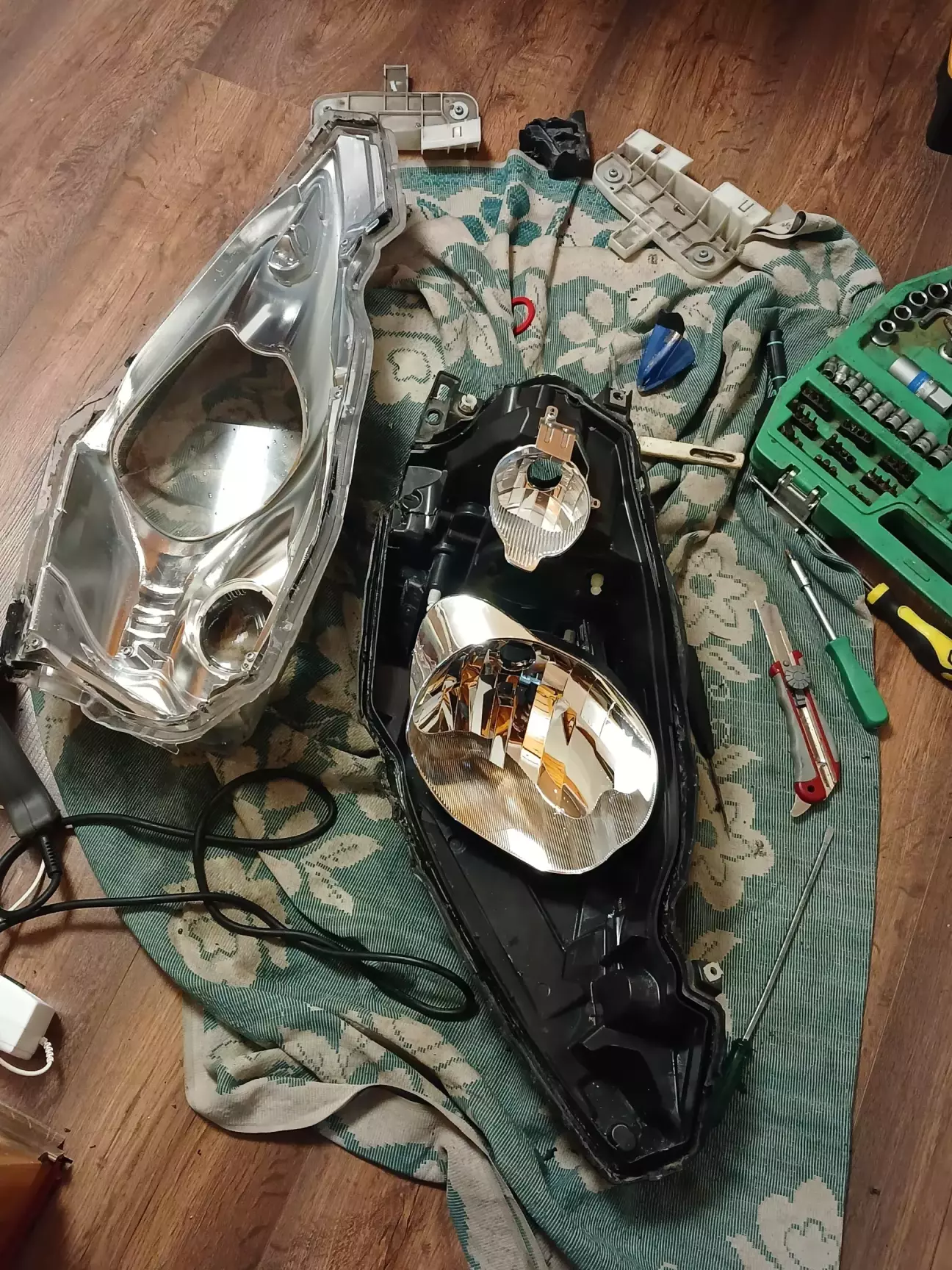 Розпаковка фар. Сказати що це був квест, нічого не сказати. авто зі штатів, було стукнуто, корпус паяний, скло посаджено вже на поуретановий герметик. ще десь у 2017 році... Прогрівання фєном, підковирювання викрутками.... 1,5 години десь на одну фару...Але вскрив, без наслідків.