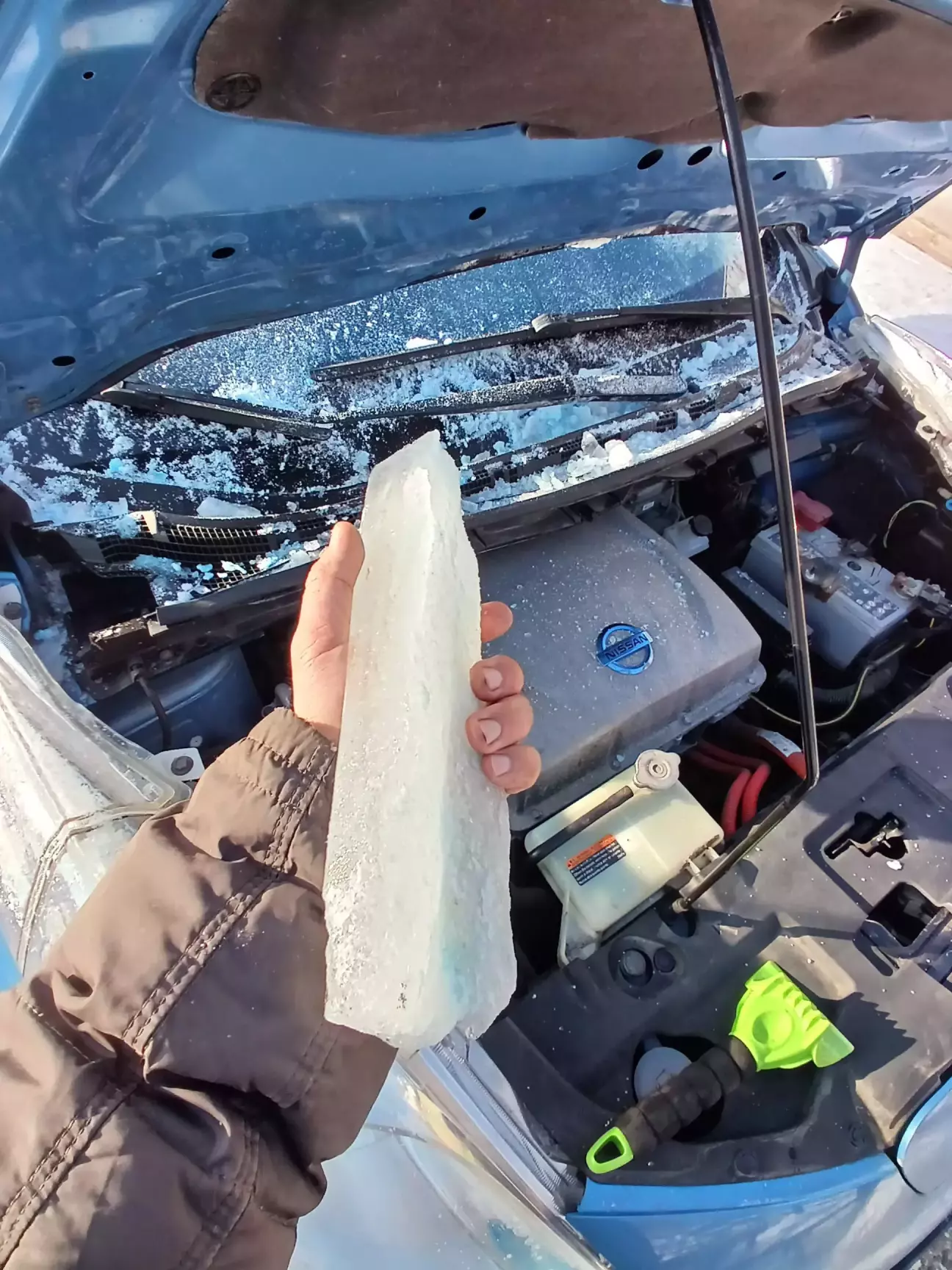 Пережила льодяний дощ... лобове було в льоді товщиною 5 мм... відігрівав 30 хв... й якось шкрябав... на наступний день зранку (саме субота сонячна була) відколпав лід у зоні двірників. ось таки брили були: