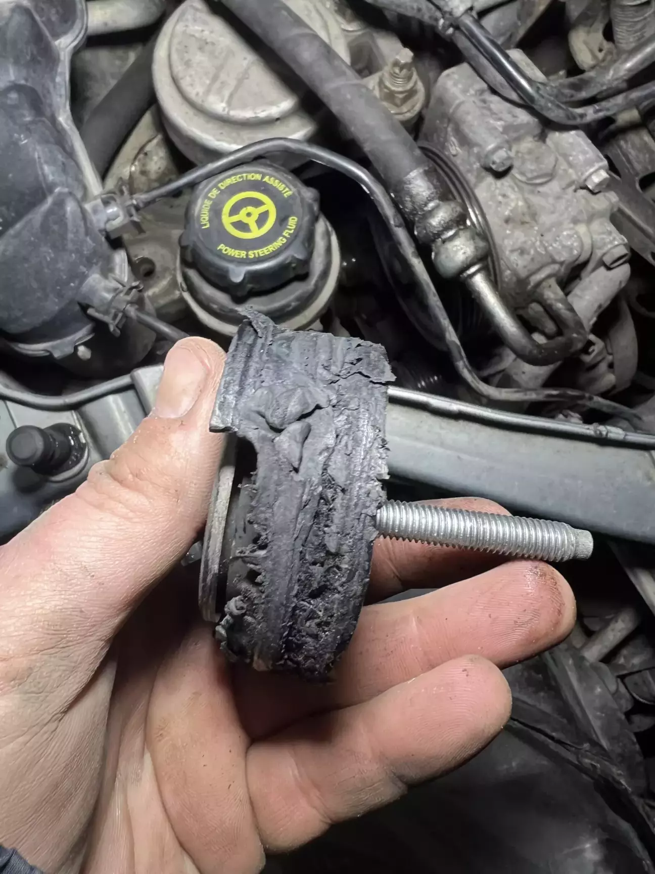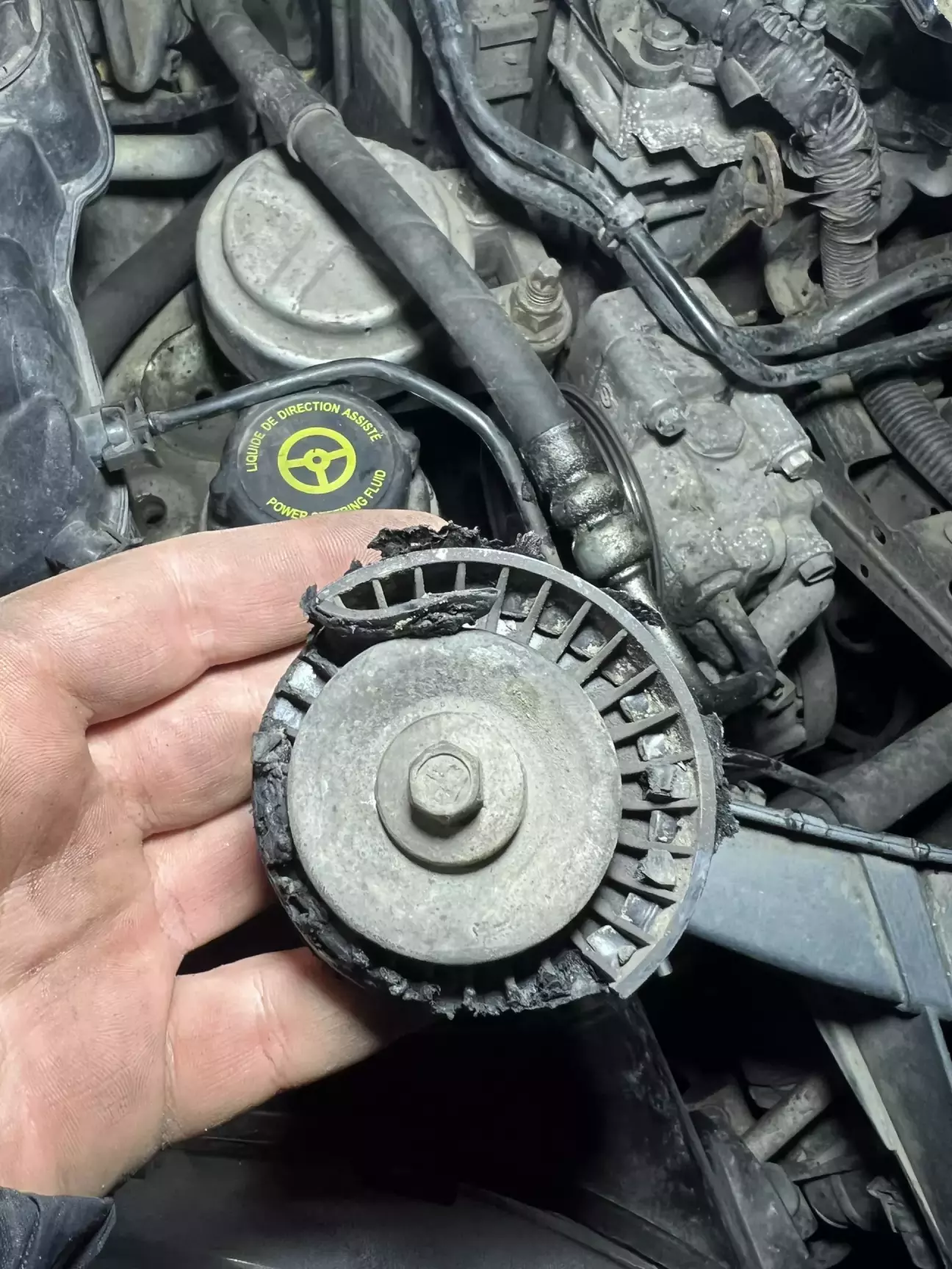 По дорозі додому почув неприємний запах паленої резини. Зупинився на узбіччі подивився зовні, відкрив капот начебто все добре, надлишкові звуки відсутні. Проїхав ще декілька кілометрів, а сморід не пройшов плюс пішов маленький дим з підкапотного простору. Знов зупинився відкрив та одразу побачив що дим з привідного ременя і відсутній пластиковий ролик на натяжному ролику, лишився тільки підшипник.