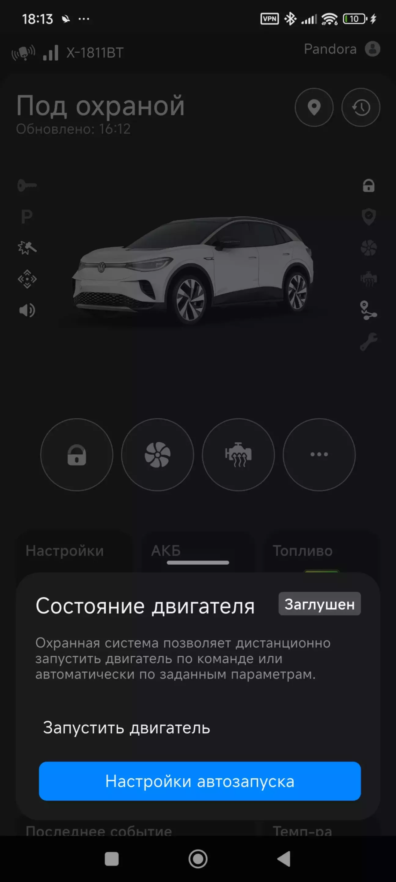 Налаштував сигналізацію, дуже довго вникав що куди і як і вчора зміг нарешті налаштувати , протестував дистанційний запуск двигуна. Можна встановлювати таймер, годину , дві ,десять, запуск по рівню заряду АКБ, запуск по температурі зовнішнього середовища, запуск по тижневому графіку , є моніторинг стану АКБ , можливість відкриття багажнику з додатку, температура в авто, назовні , стан охоронної системи. В цілому прикольна штука і зимою ну дуже потрібна, виходиш а машина вже прогріта.