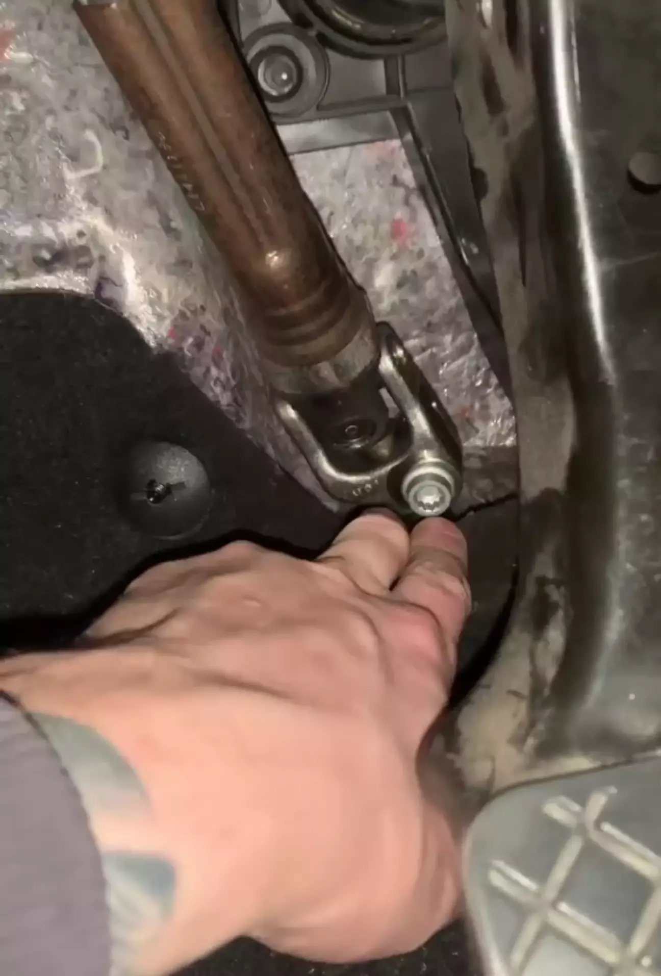 Поставив пильник назад, почав крутити кермо — стук чітко віддає в ноги. Знову прийняв позу раком і поліз у педалі. Покрутив кермо ще раз і помітив, що кардан нещільно сидить на валу.