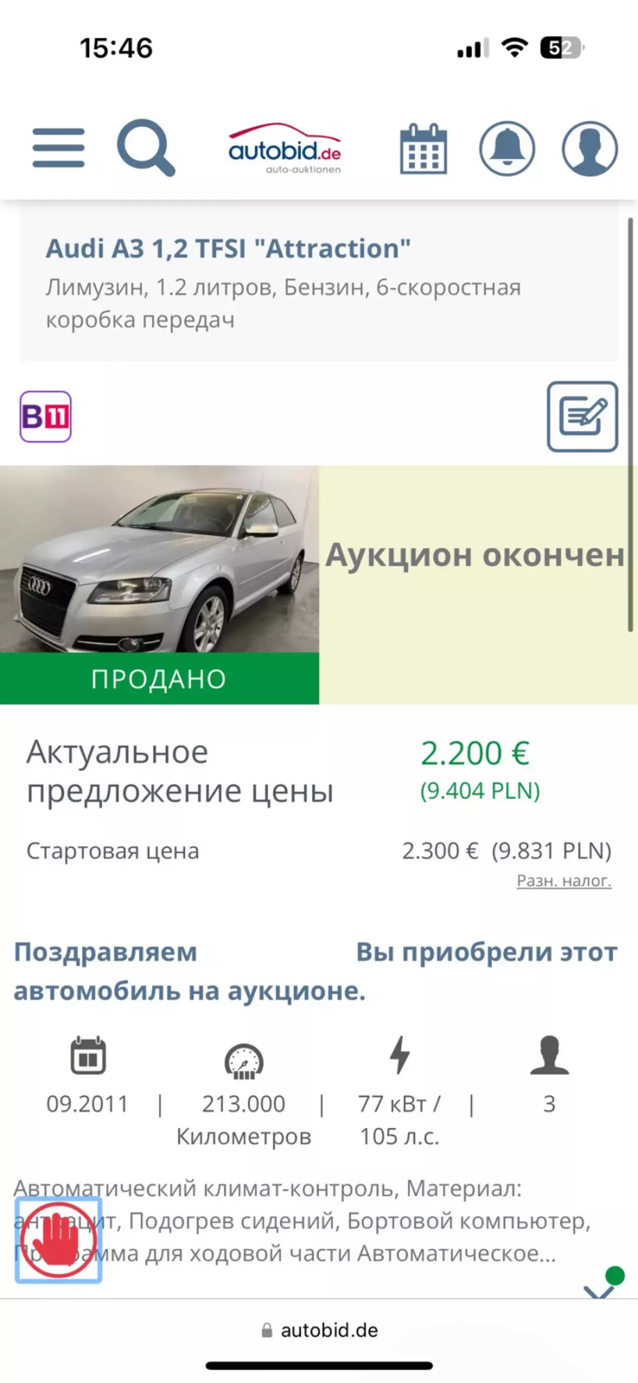 І ось мене автоматично перекидає на наступний лот- Audi a3 8p 1,2 tfsi яку я дивився до цього просто листаючи фото, але невіть не думав робити ставки.Майже останній лот на аукціоні.Починаю ставити і якимось дивом виграю акціон дешевше навіть стартової ціни, за 2200 євро.