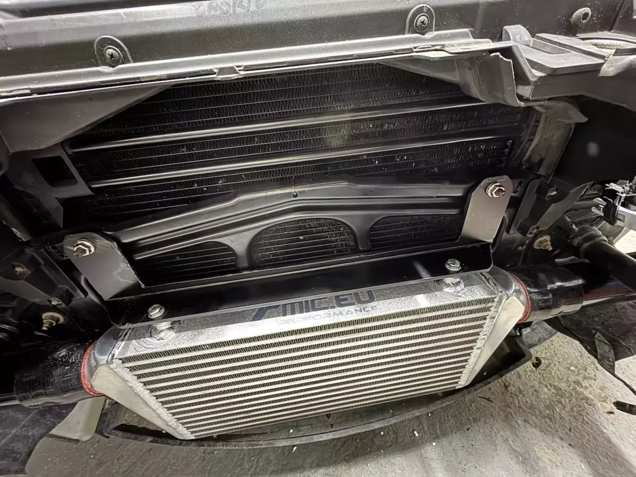 Насправді ті надруковані кондуктори не дуже допомогли, адже з патрубками в 2.5 дюйма - зазор між кронштейном бампера над патрубком і повітропроводом гальм під патрубком був по 5мм.