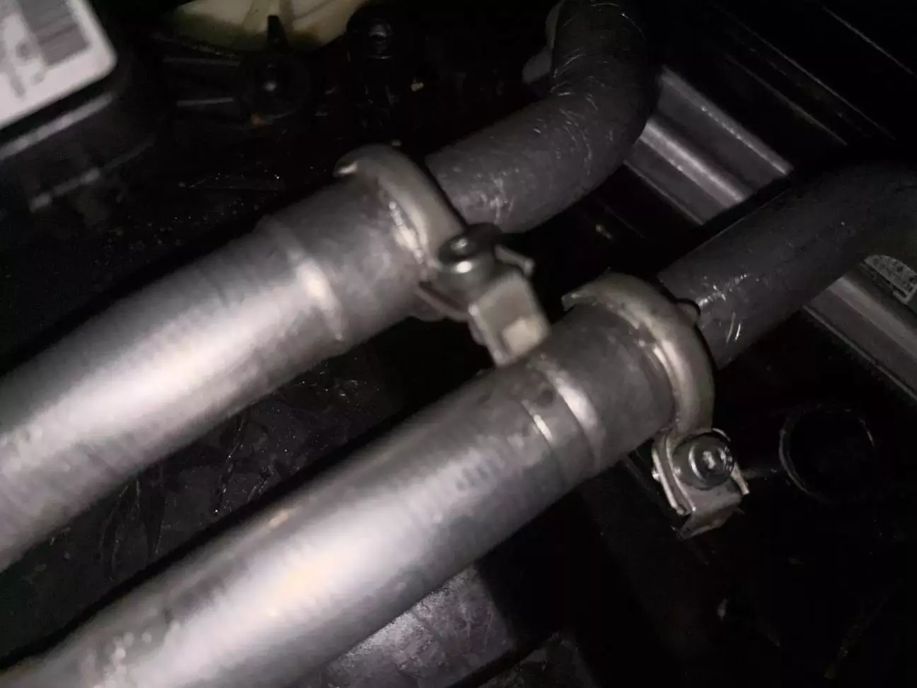 На трубках радіатора з фото вище встановлені 2 хомути, відкручуємо їх. Трубки мають розвальцювання, та ущільнювач всередині, тому можуть погано зніматися, використайте щось тонке, щоб роз'єднати їх, спочатку можна якусь одну, щоб антифриз пішов легким струменем. Акуратно підставте тару для злиття антифризу(сумарно вийде десь 2 літри) та обкладіть весь простір довкола робочої зони ганчір'ям. Для остаточного демонтажу рекомендую відкрутити кронштейн, що лівіше від трубок та трохи відігнути його. Тоді радіатор можна витягнути без пошкоджень трубок.