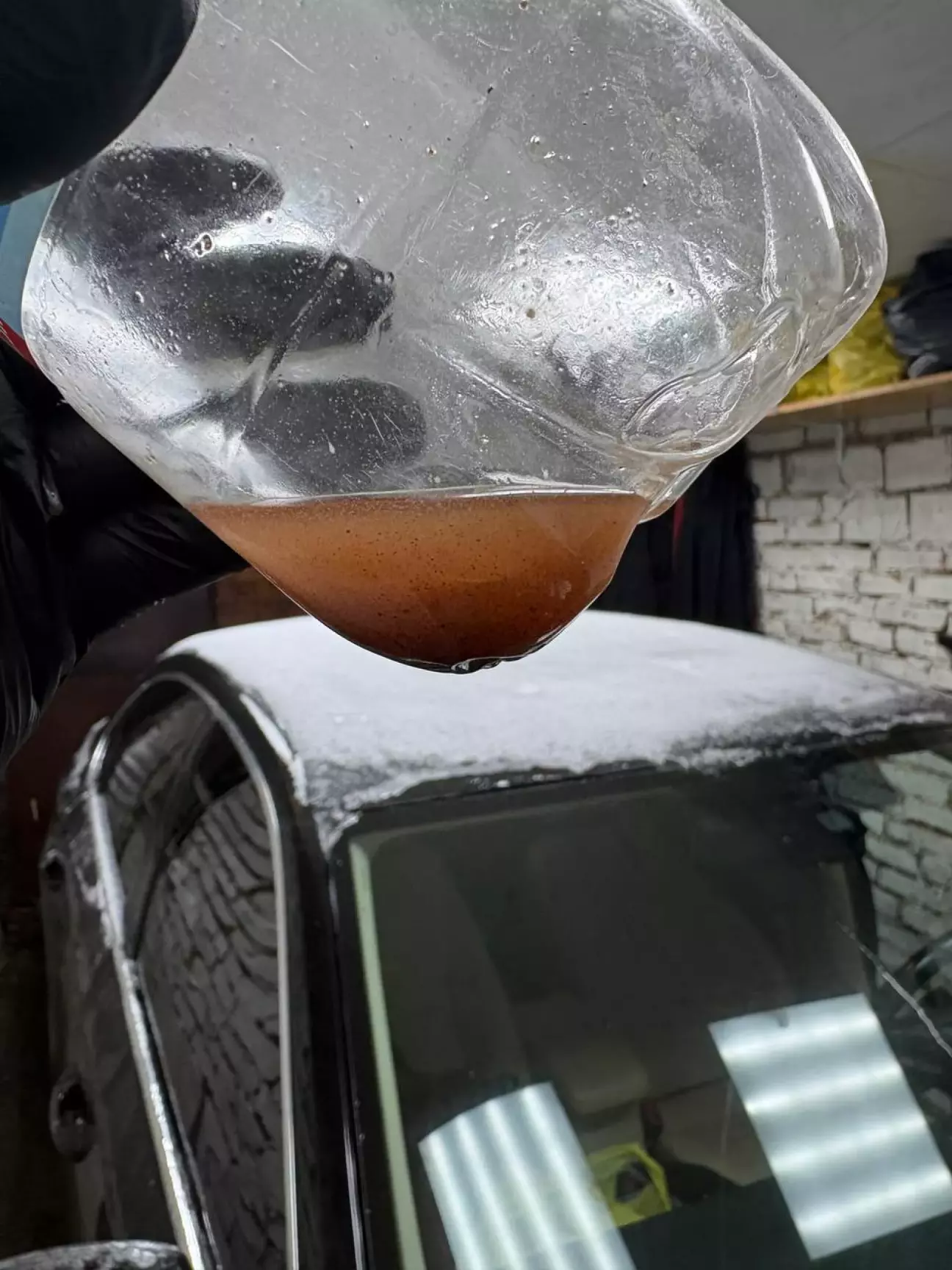 Рекомендована температура для розчину 40-50 градусів за Цельсієм. Заливаємо порційно(зі сторони зворотки перші рази, пізніше чергуємо зворотку та подачу, це допоможе ще більше не забити його) на 10-15хв, акуратно калатаємо, перевертаємо радіатор. Жодних продувок стисненим повітрям! Тільки ротом, але після кількох залитих розчинів, без надзусиль, оскільки перегородки між каналами радіатора дуже тонкі, будь обережні! Поступово після чергових заливок розчину область радіатора, що нагрівається, збільшуватиметься. Я витратив 75 мл промивки та 5 л дистильованої води. Останні промивки були виключно дистилятом. З радіатора зливалося всяке різне, були й невеликі пластівці.