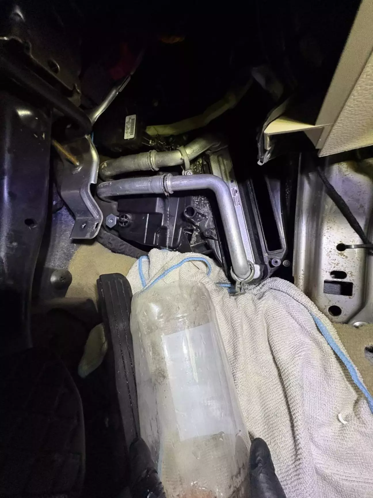 Знімаємо декоративну накладку лівого торця радіатора пічки. Пощупав трубки: подача ледь тепла, зворотка практично холодна. Значить радіатор забитий.
