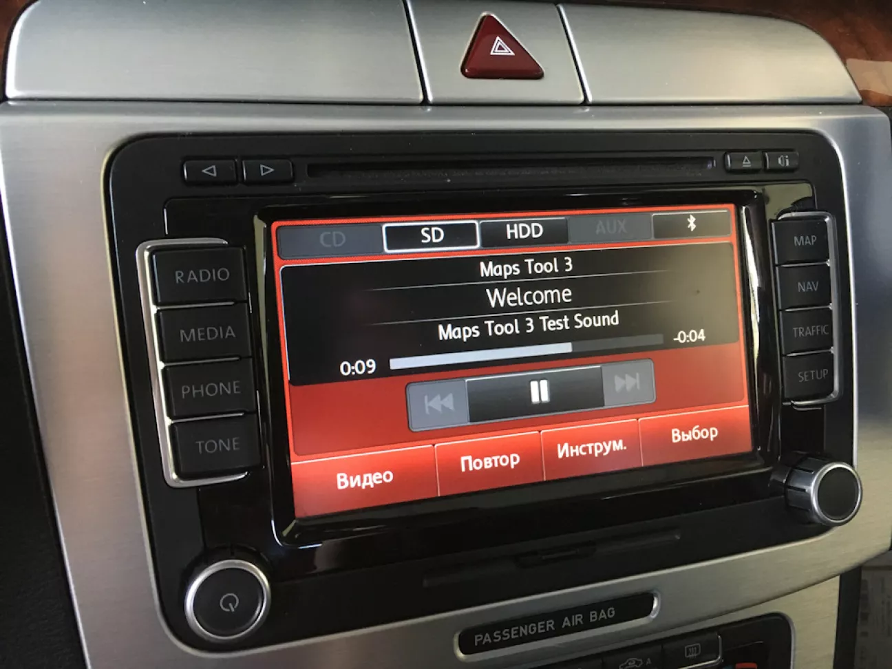 Вставляємо карту памяти SD и переходимо в media в вкладку SD і повинен заиграти мелодія на английскій мові від програми MapsTool.