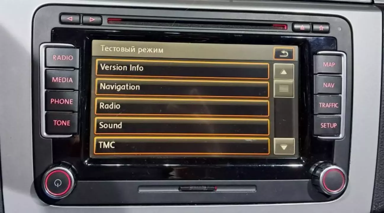 На включеній нагнітолі наєимаємо кнопку SETUP та тримаємо біля 10 секунд.спочатку з'явиться сервісне меню Radio кнопку не відпускаємо та продовжуємо тримати до появи меню "Тестовий режим"