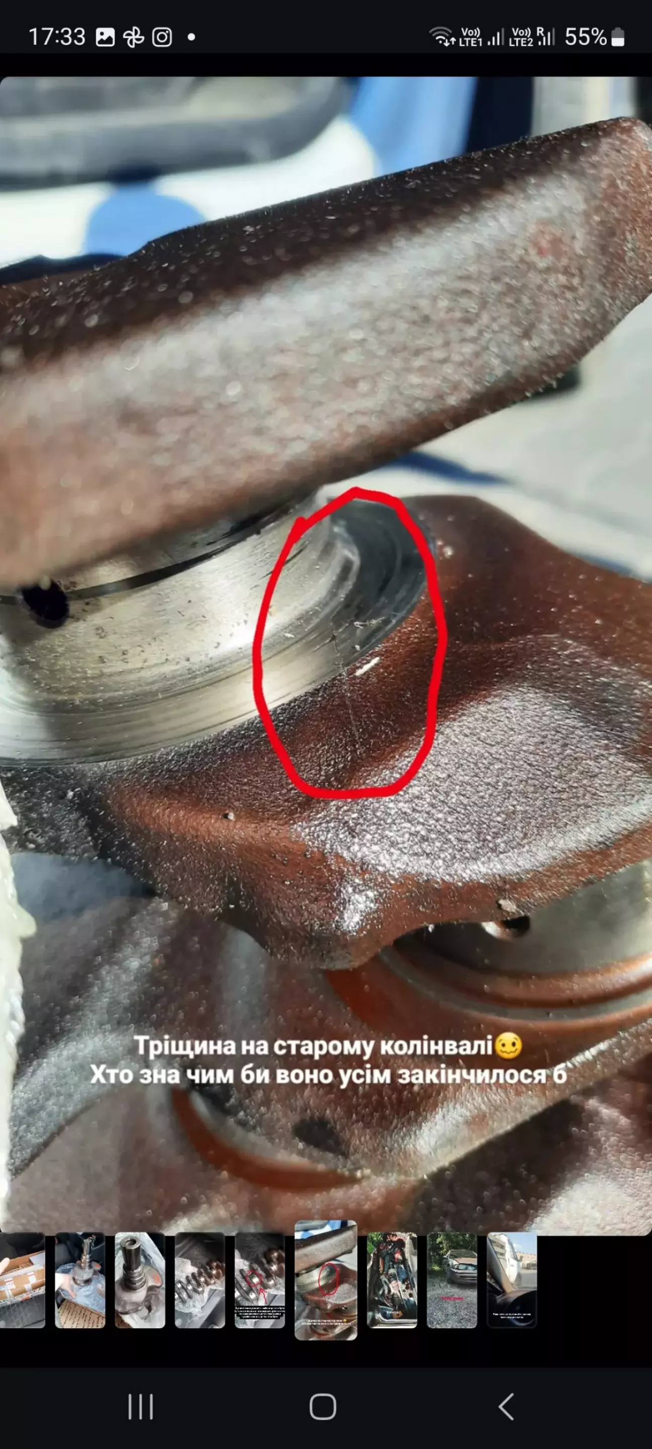 А старий колінвал був весь ушатаний весь у коліях на шийках, і закічуючи мікротріщиною на фото видно