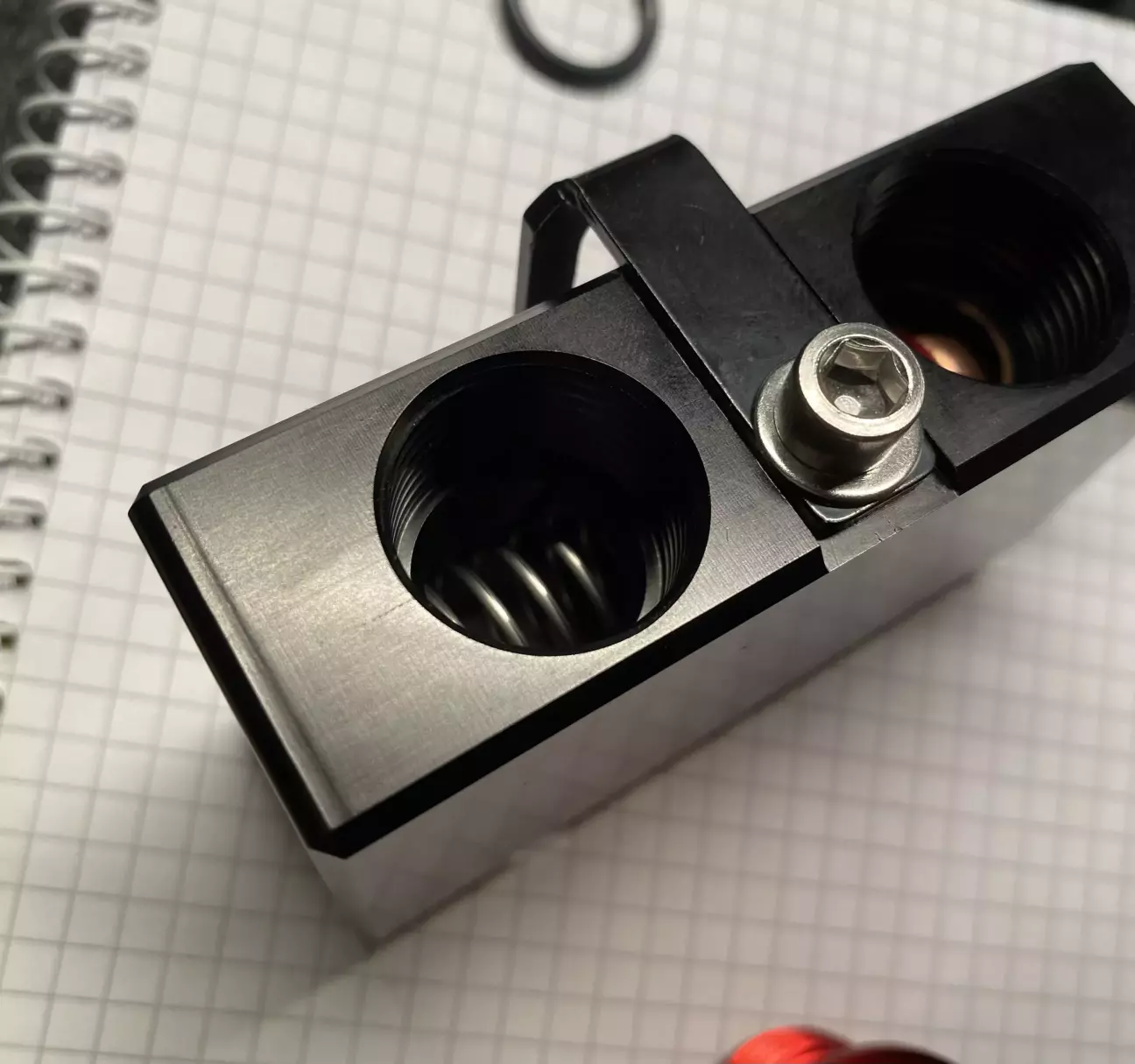 гарно оброблений кусок алюмінію, an10 штуцери, термоелемент як в китай компресорах (до нього питань нема), кучка орінгів і 2 пружинки)