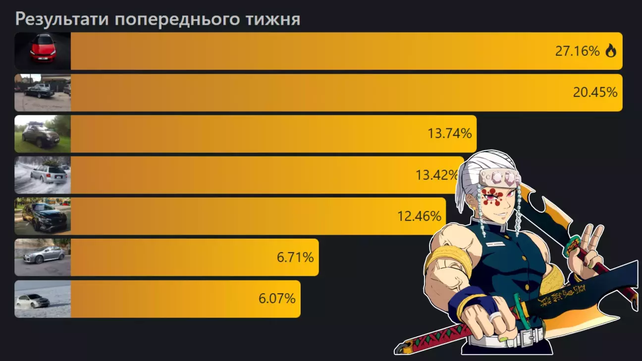 “Авто тижня” забрали. Тиждень наш, знову замахнулися на місяць, конкуренти серйозні. Треба б піднатужитися, а тут то і часу немає з одної номінації в другу одразу. Ну нічого ми то так просто не здаємося, цього разу хочеться виграти. 🏁