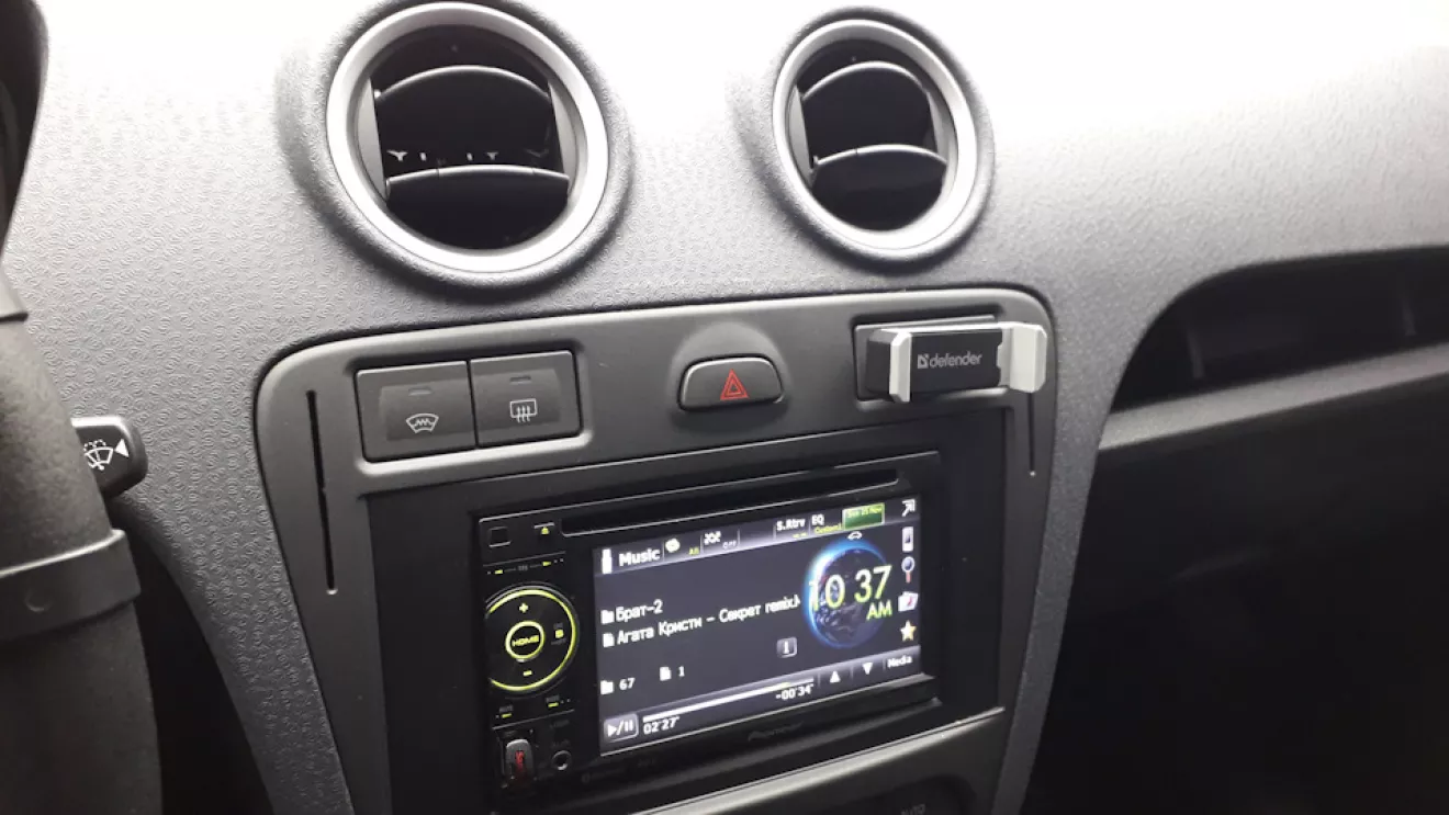 Сначала хотел как-то использовать прорези для карт, но их расположение не годится. Та что ближе к водителю — перекрывается рулем, та что ближе к пассажиру — далековато.