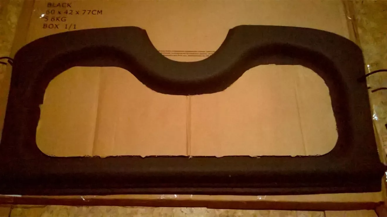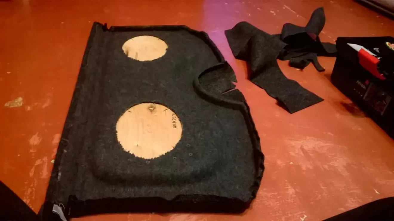 С тех пор планы немного поменялись, динамики временно снял, а с дырками в полке надо что-то решать. Решил убить сразу двух зайцев: усилить полку если в будующем верну динамики обратно и закрыл дырки. Еще один "+" сего мероприятия в том, что полка теперь будет тоже в карпете того же тона, что и багажник.