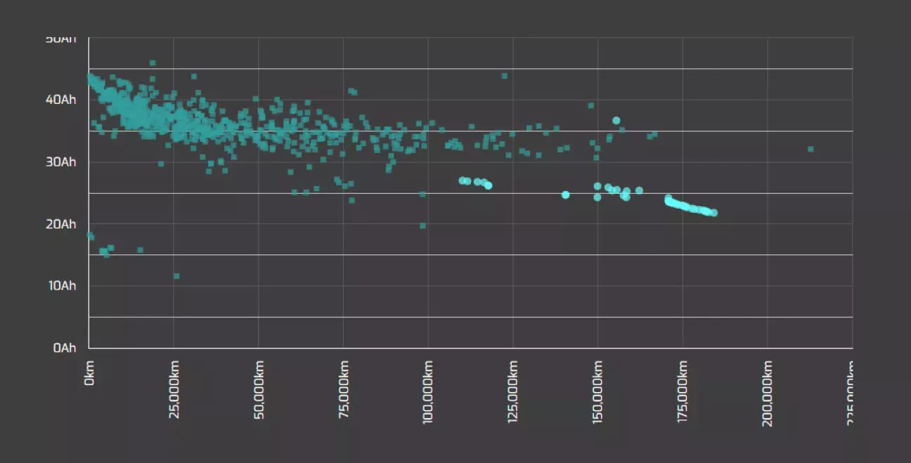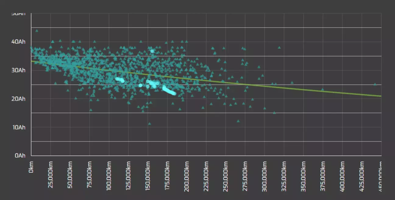 Яскравими точками показано SOH мого авто 2015 року, купленого у 2021 році з пробігом 100 тис. км і SOH 73%. Викид у вигляді точки у 2023 році — це я зробив BMU Reset :D
