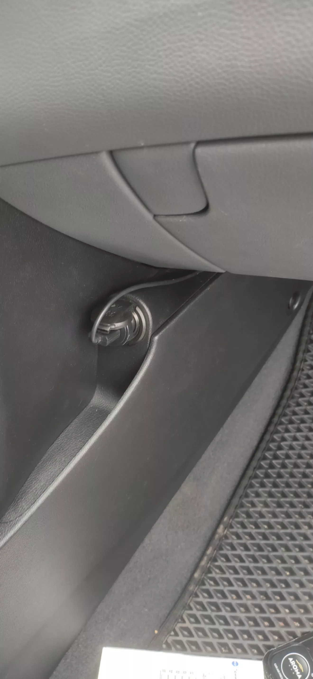 Подключил в прикуриватель возле ног пассажира, изначально хотел что бы был спрятан в маленьком бардачке, но там закрыто все наглухо.