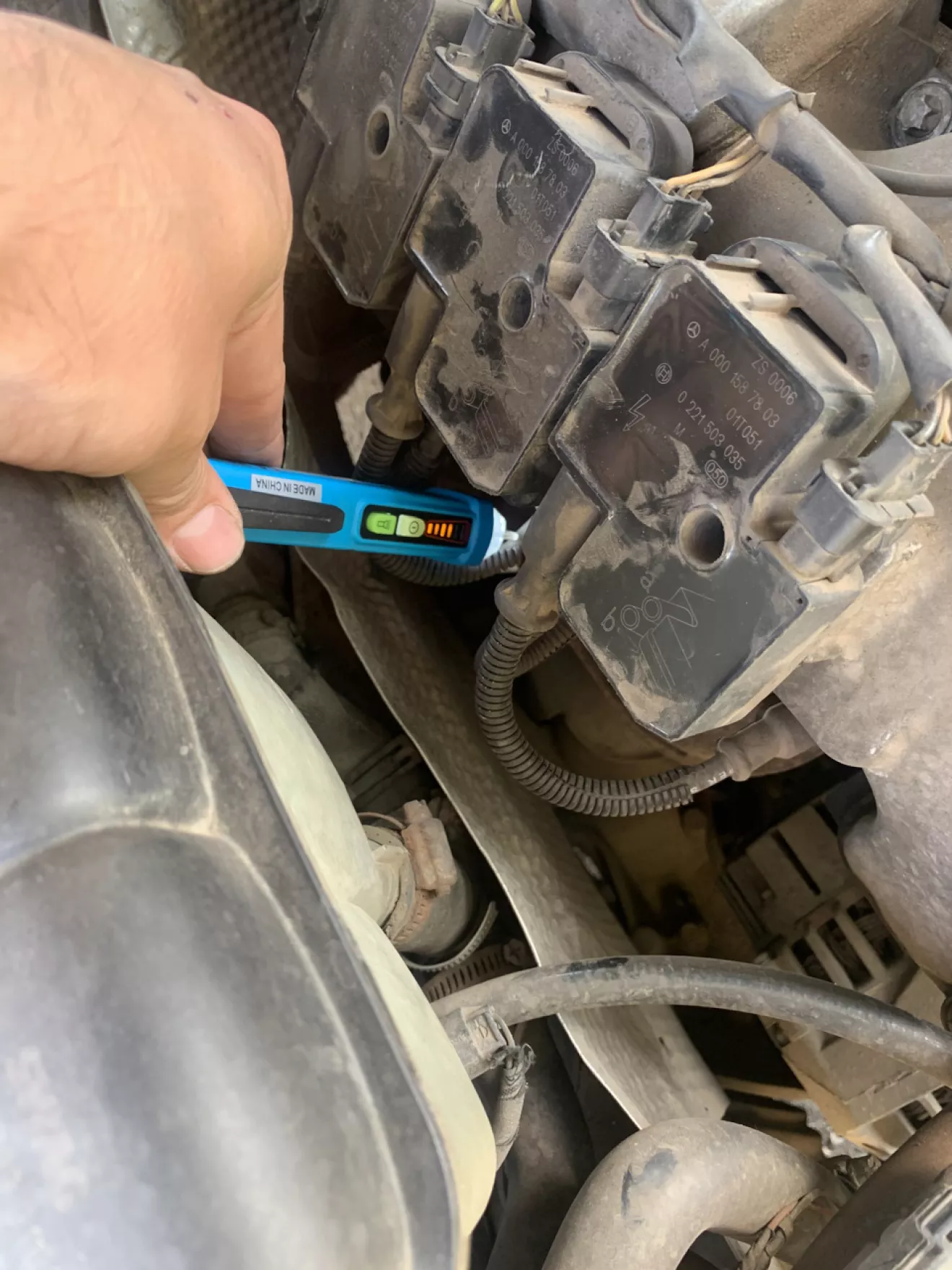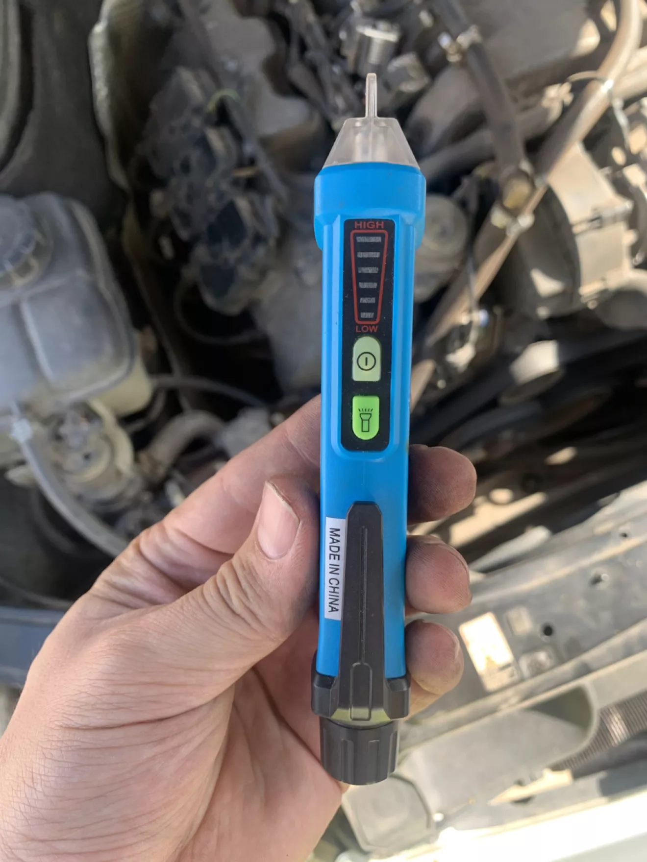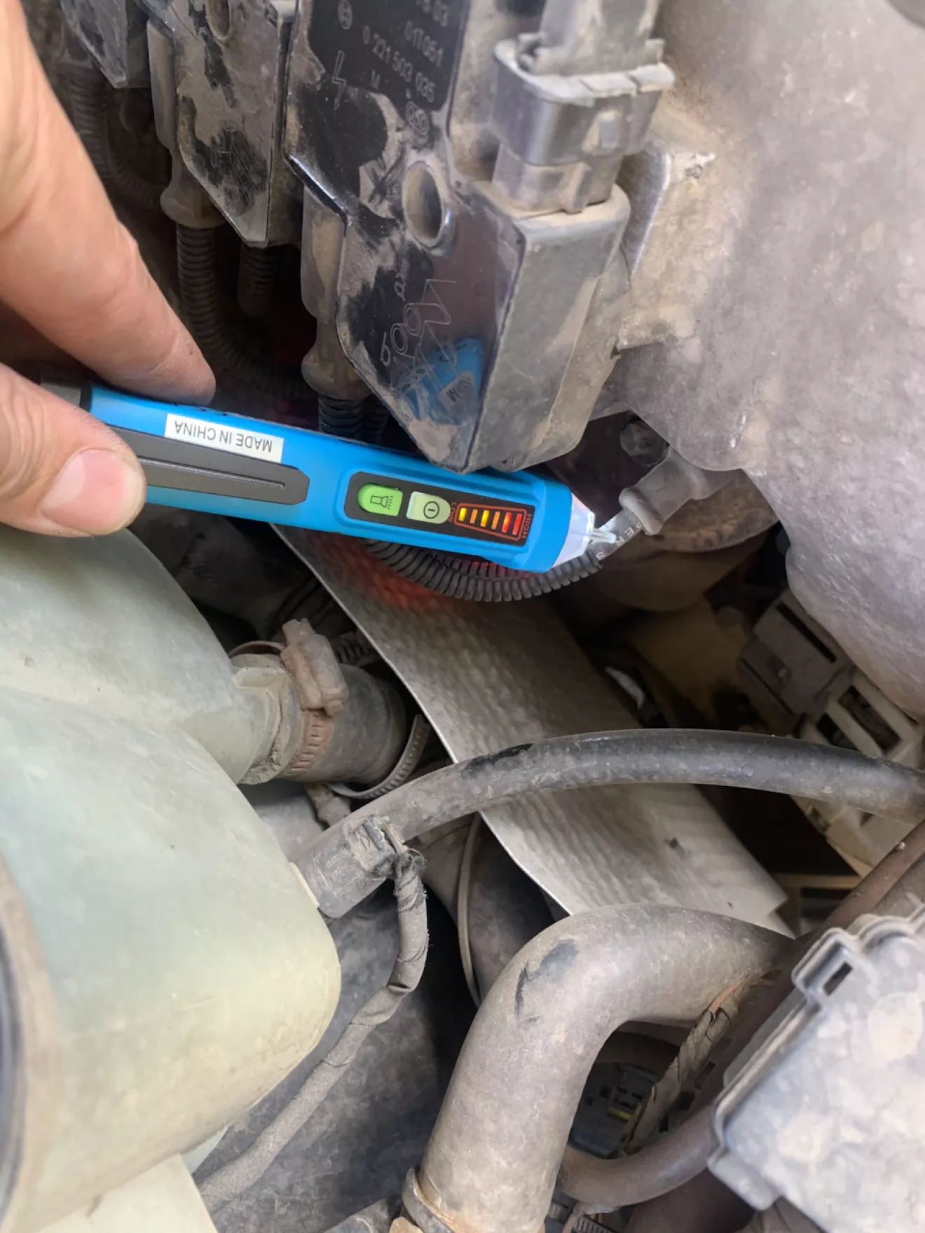 По идее проверить правильную работу катушек поможет осциллограф, но тащить его к машине и подключать у меня не было никакого желания. И тут я вспомнил, что пару лет назад, в Китае, за 5$ заказывал бесконтактный тестер для проверки наличия напряжения в проводах.