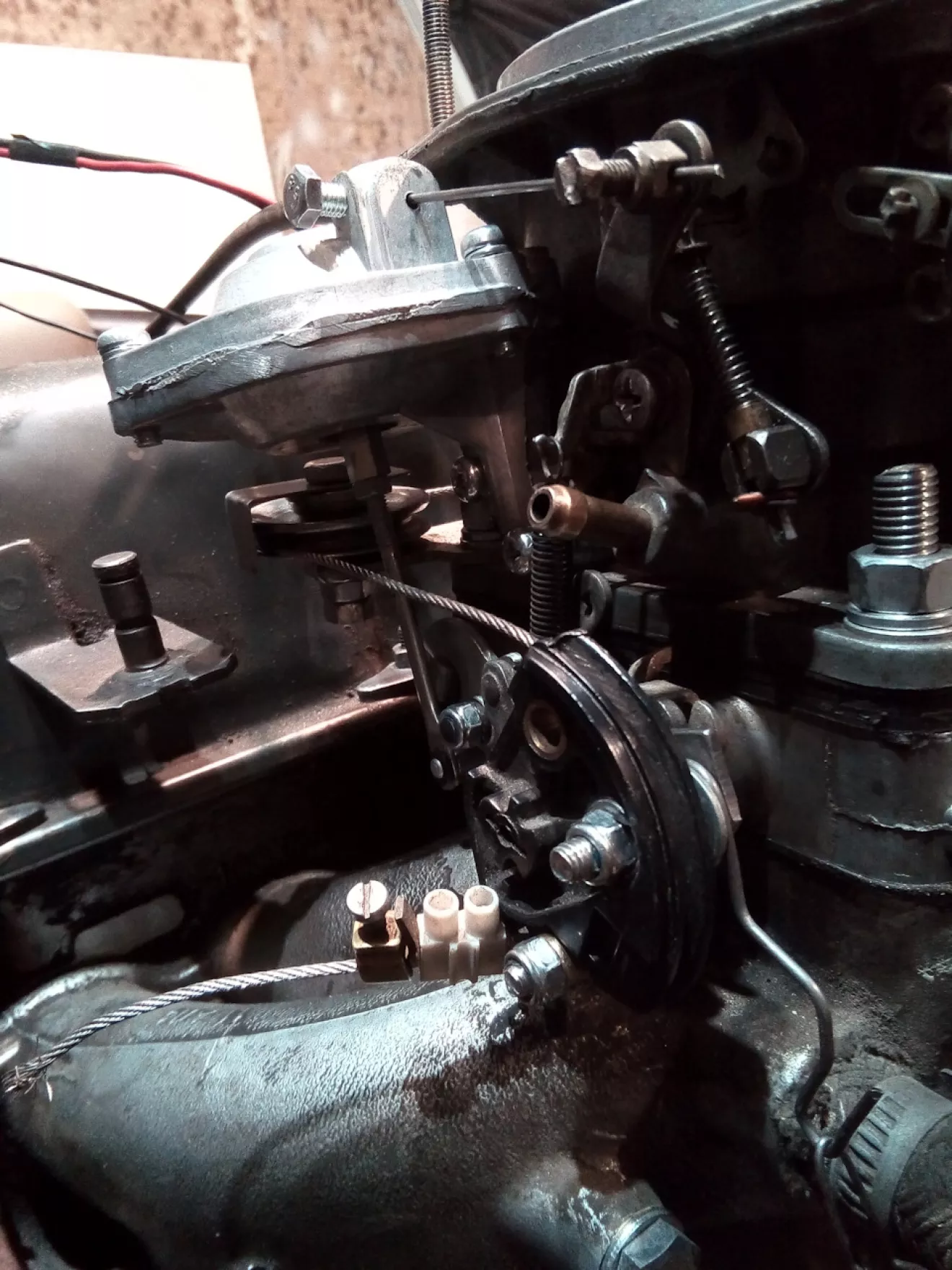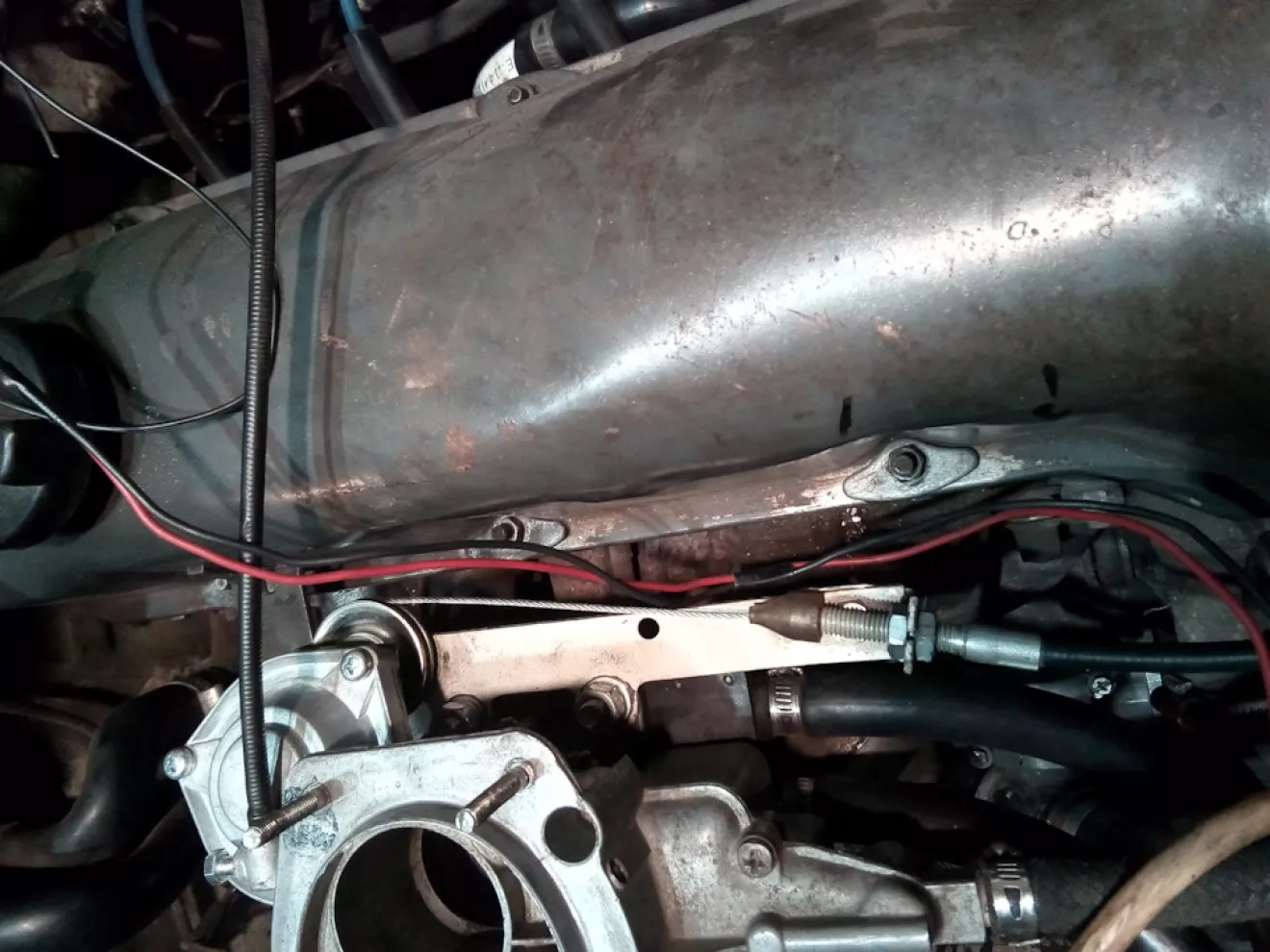 Вернул пневмопривод второй камеры так как на малых объемах (1300) при механическом открытии второй камеры наблюдается провал по мощности, (такого нет на 1500.1600 там мощи хватает для разгона авто). Установил кронштейн чтоб тросик педали газа не спадал с ролика.