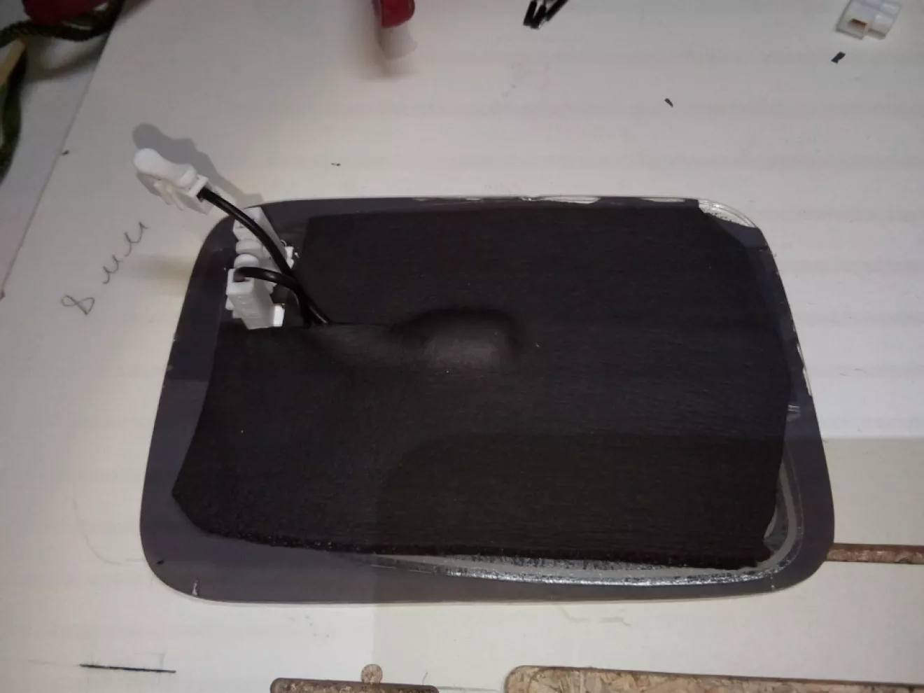далее переходим к зеркальным элементам, отмываем, обезжириваем, наклеиваем термоэлемент, приклеиваем примерно по центру термостат, все это сверху утеплил для снижения потери тепла