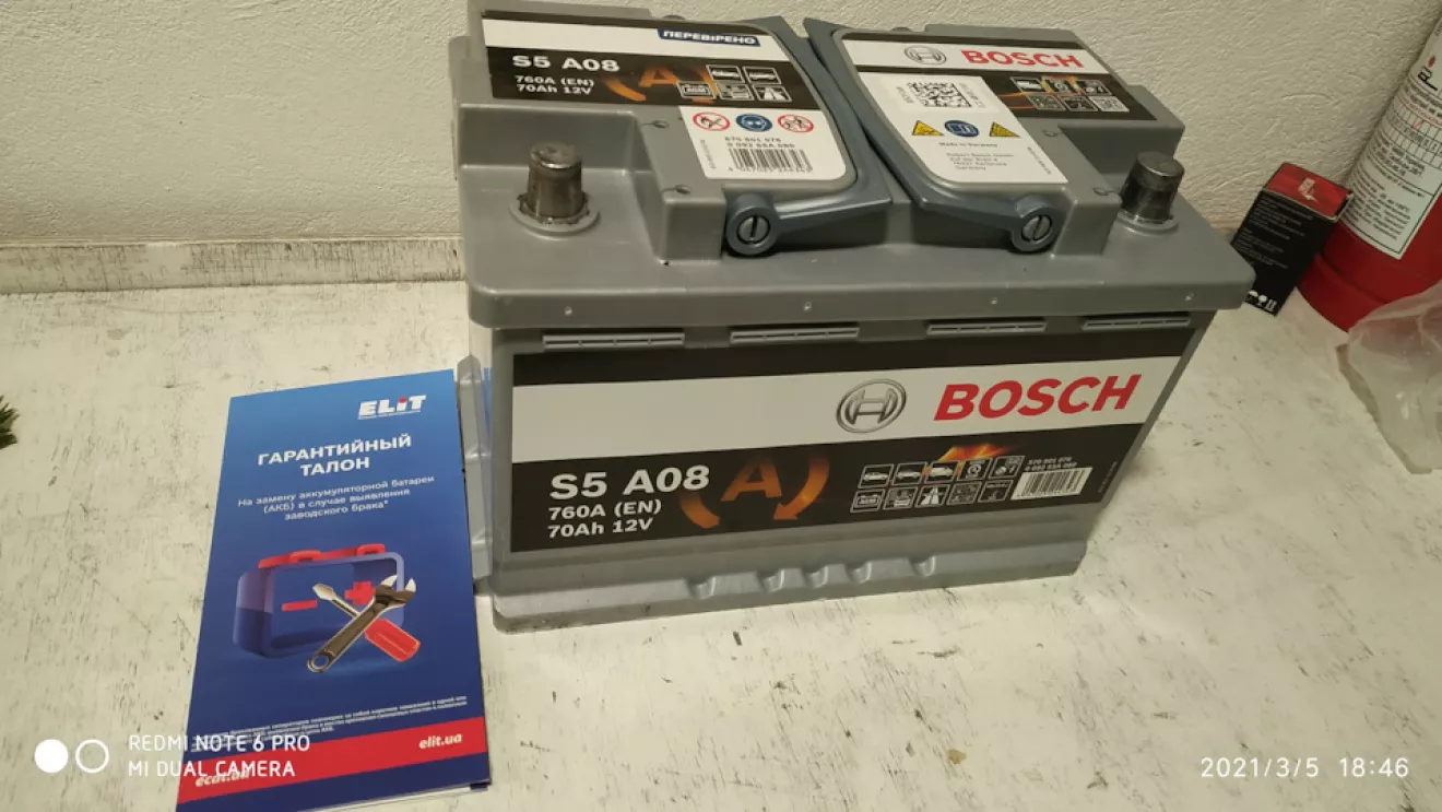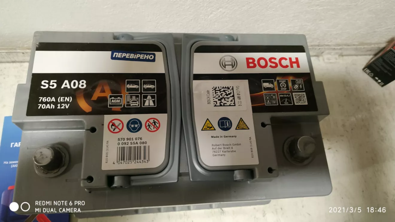 З тих акумуляторів AGM, які були в наявності в моєму місті вибрав Bosch S5 Agm. В магазині перевірили його вольтаж (12,7в), та зробили тест "нагрузочною вилкою", поставили пломбу, виписали гарантію на 24 міс. Після заміни акума, в меню бортового підтвердив заміну АКБ на нову.