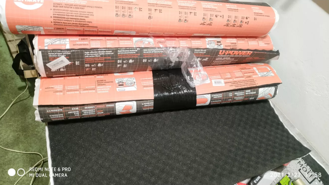 Шумоизоляция Ultimate шумопоглигаючий матеріал клеїв на самі карти. Ціна на нього не дешева, зате зручний у роботі, так як достатньо еластичний і дає результат. 3х листів мені вистачило для поклейки 4 х карт дверей та ще полоска залишилася на кришку багажника)