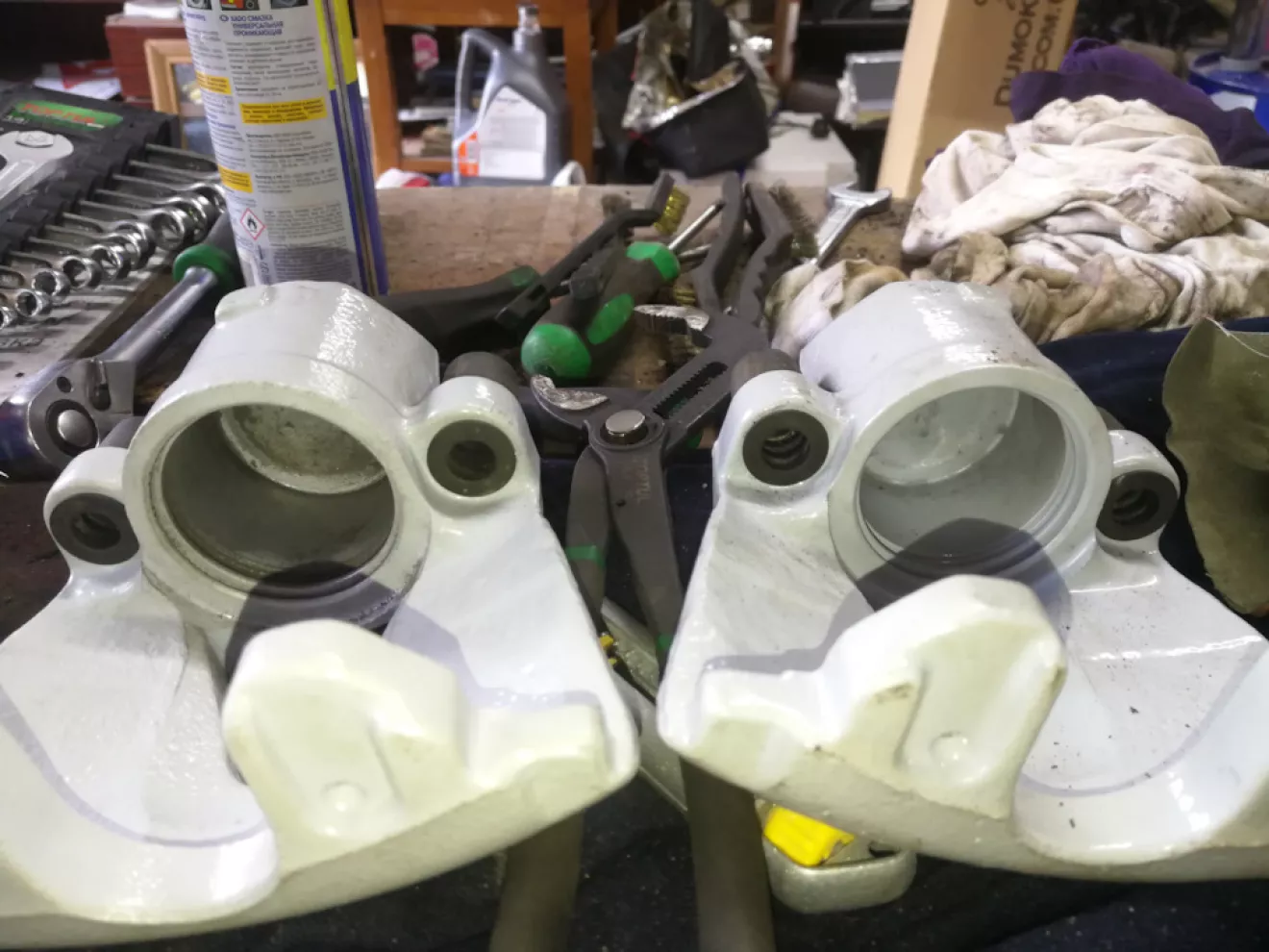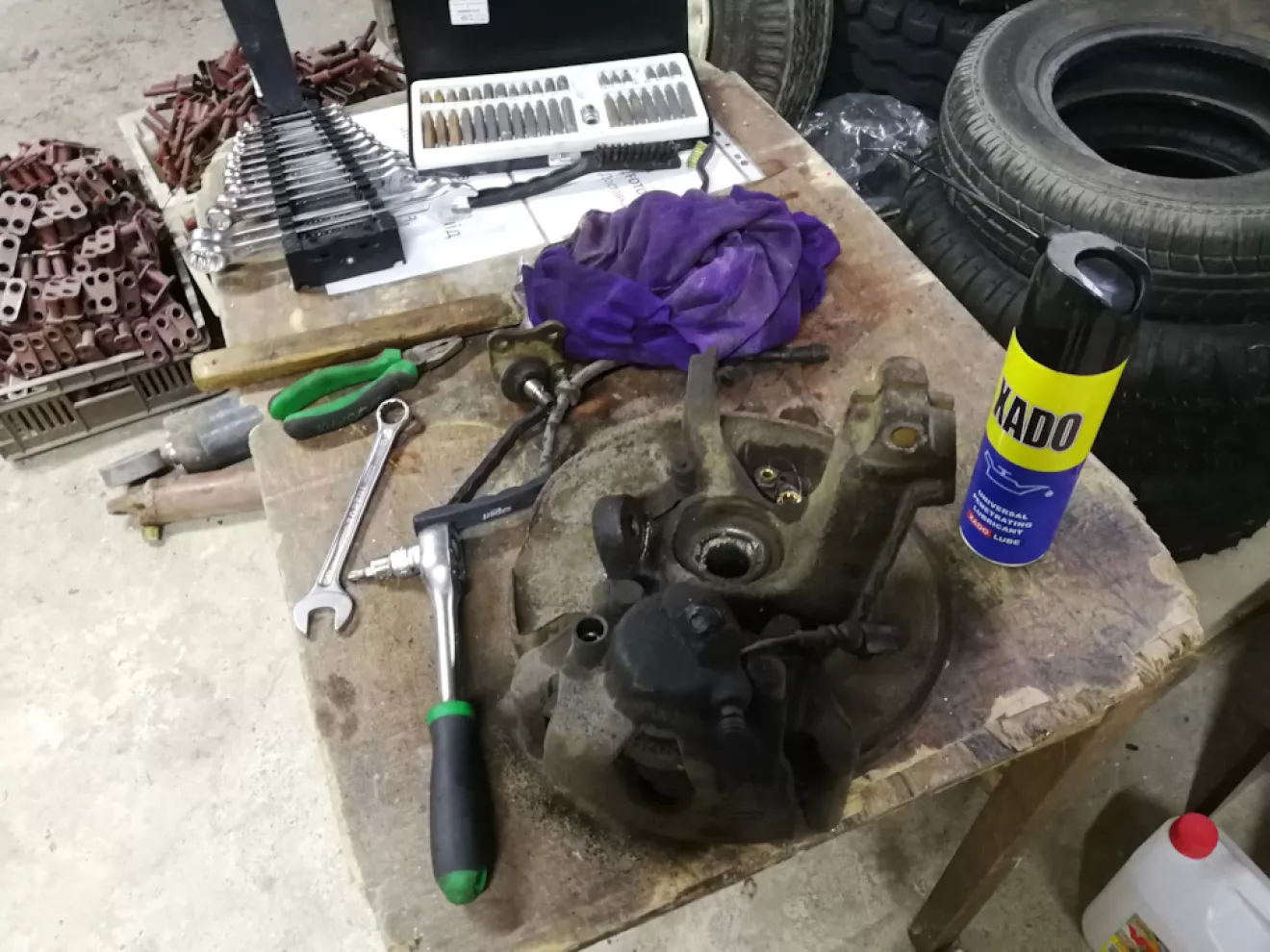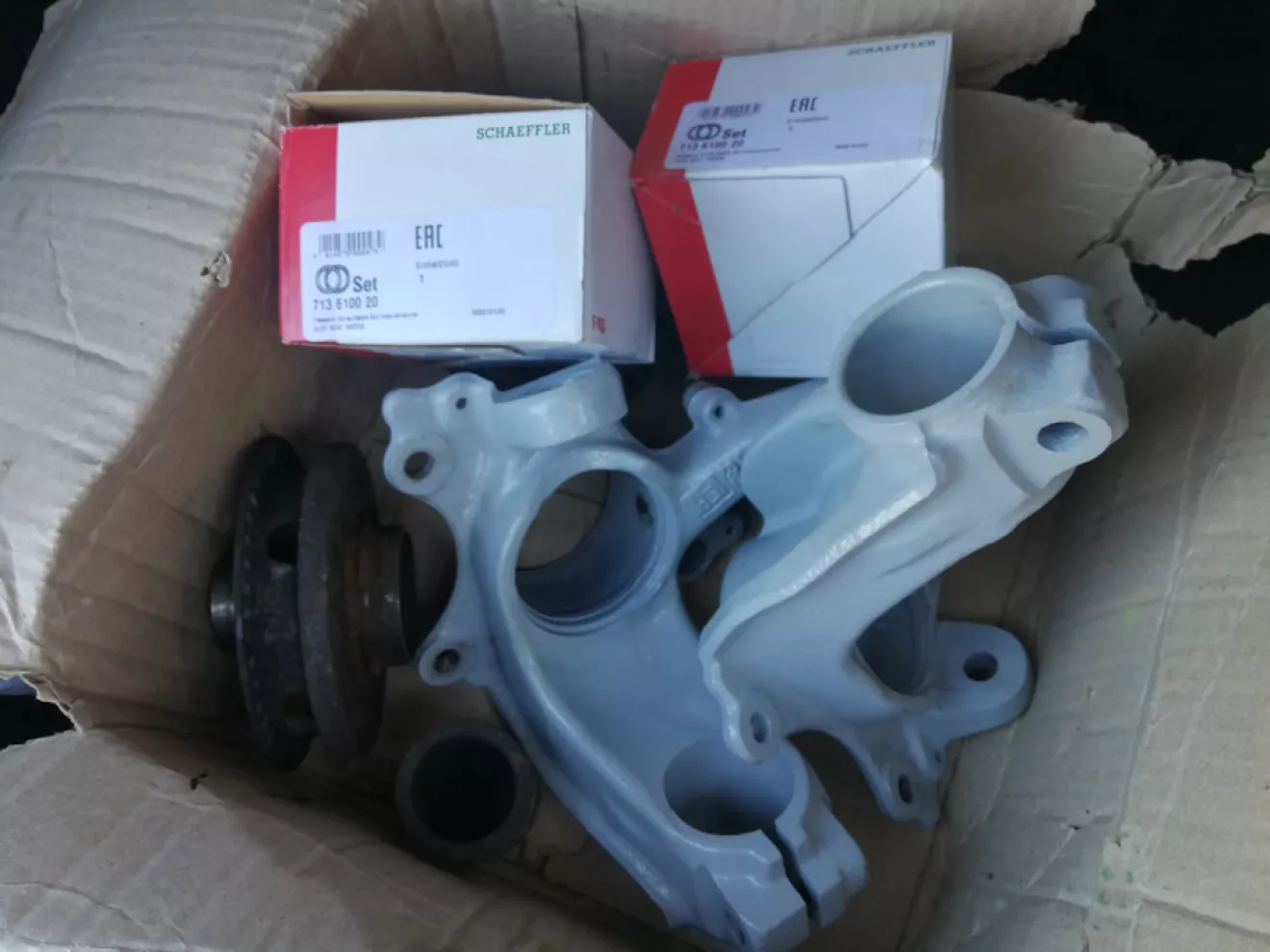 Замовив нові підшипники FAG 713 6100 20 (1531.03 грн. за пару) і один ремкоплект супорта Autofren D4260 (188.22 грн). Щитки дисків поставив зі свого комплекту. Вони однакові. Мої були новими, а комплект з Польщі приїхав з трухлими. Запресовували, випресовували підшипники на сервісі, допомагали з проблемними болтами теж. За все 500 грн. Пофарбували ще за 500 грн. Збирав все сам, комплект встановлювали на сервісі, бо у мене елементарно нема як і чим. Робота 800 грн. Попутно замінив правий рульовий накінечник Lemforder 22251 — 404,54 грн.