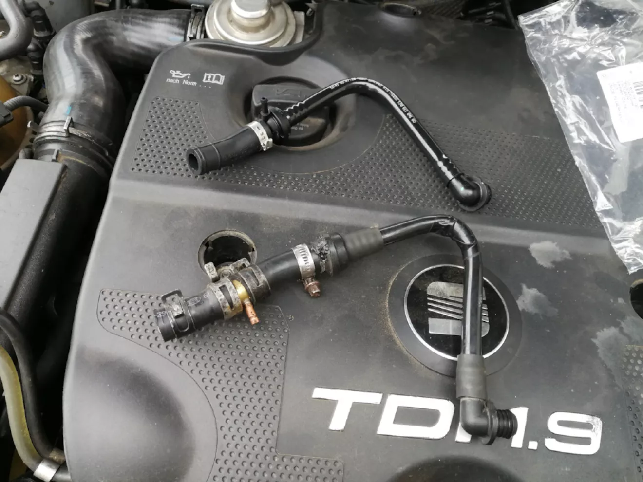 При заміні випадково зламали штуцер клапана на вакуумній магістралі. Він уже колись до мене паявся, тому нічого страшного. Буде новий. Прямо в сервісі на швидку руку змайстрували новий штуцер, бо треба було їхати, а без вакууму гальм не було. На кінець поїхав усе одно майже без гальм, бо при встановленні магістралі тріснув сам патрубок. Ізолентою вилікував патрубок і поїхав собі. За кілька днів приїхала нова оригінальна магістраль магістраль VAG 1J0 612 041 GD — 1267 грн. Замінив уже сам. Якшо є чим зняти хомути, то проблем нема жодних.