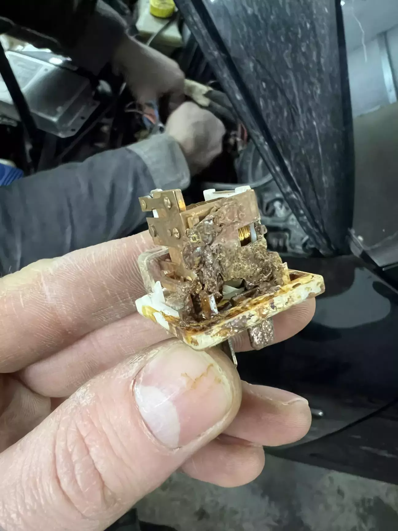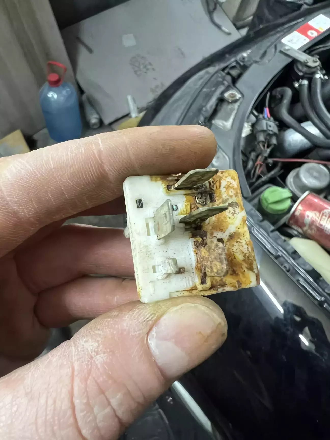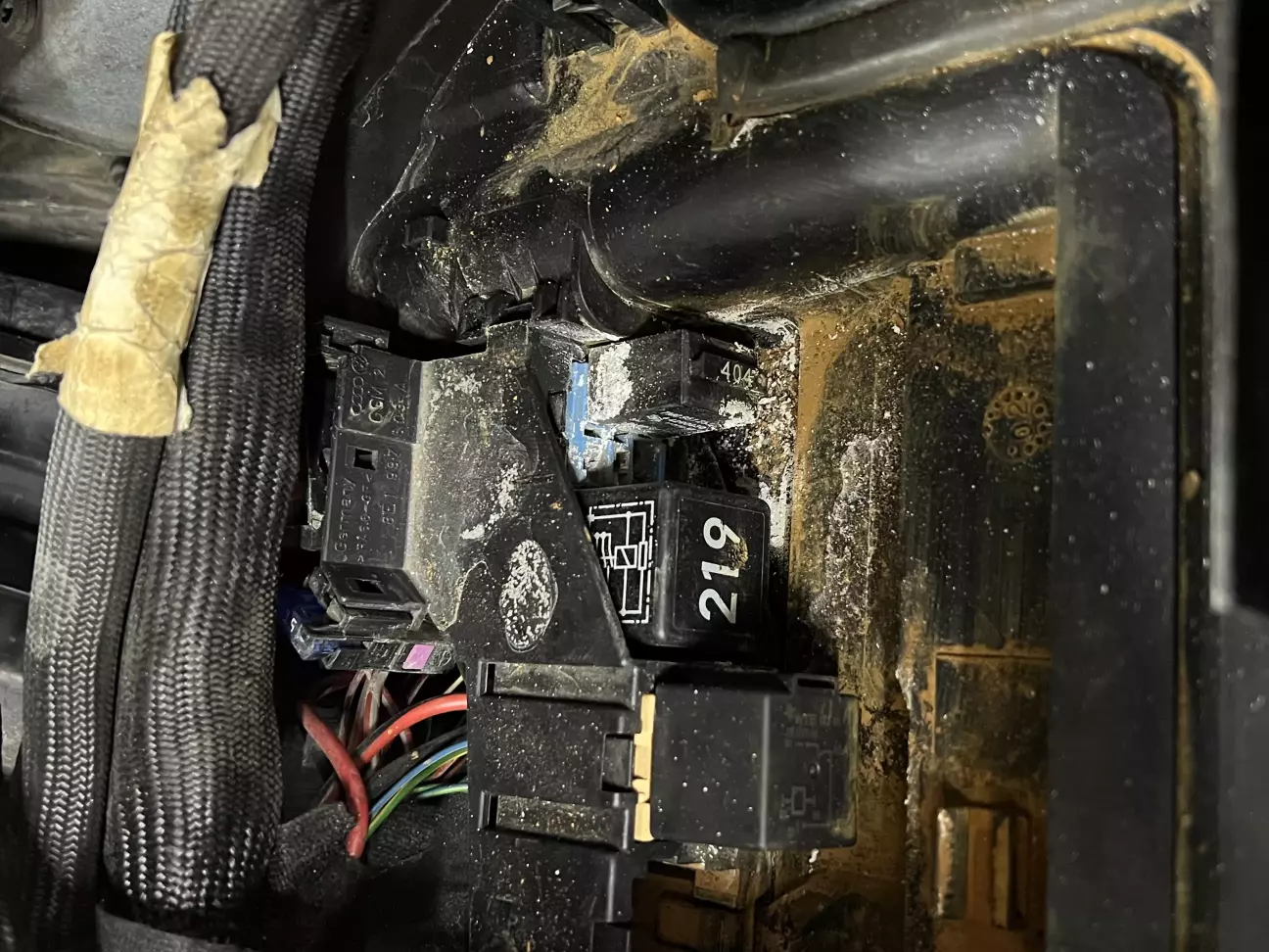 Десь за кілька годин був поставлений діагноз : тріснувша кришка де розташовані блоки і реле куди попадала вода , результат на фото і одне із важливих реле було завжди в замкненому режимі. Проблема вирішена поставкою нового реле та нового розʼєму .