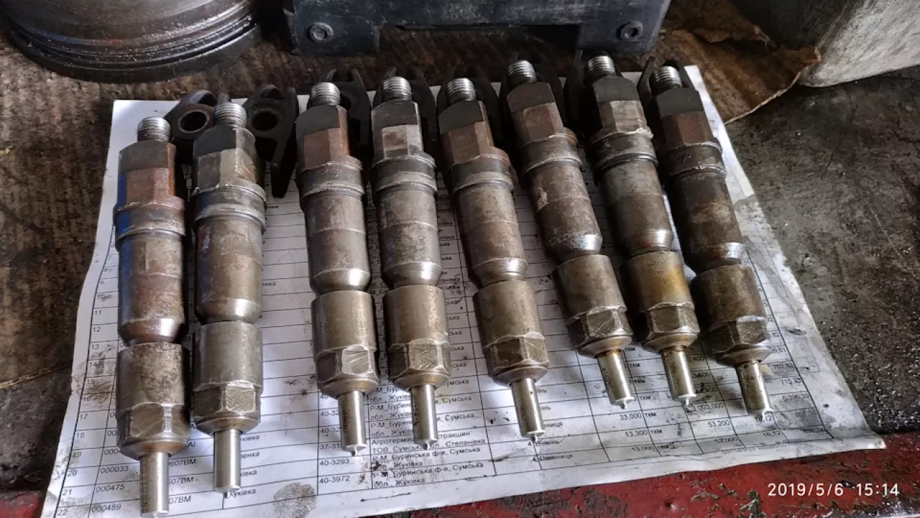 Если делать всё правильно, то гильзы очень легко садятся на свое место. Если у вас гильзы не садятся, то вы делаете что-то неправильно. После этого принялся собирать поршня с шатунами. Как уже было сказано ранее, шатуны мы взяли со старого двигателя. Насколько оправдано это решение покажет время. Нашёл время и для ревизии форсунок. Из 8 работало только 2. они хорошо распыляли топлива и показали приемлемое давление в 250 атмосфер. Остальные льют и показывают разное давление. в результате установили новые распылители. Благо у нас есть стенд на котором можно легко проверить и выставить нужное давление срабатывания форсунки.