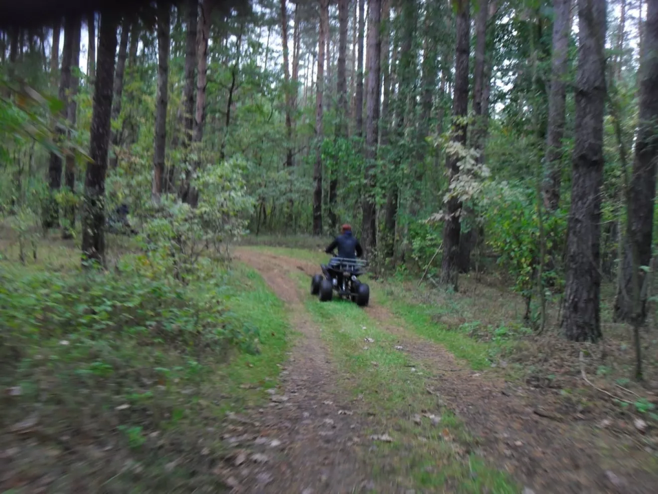 Впереди остался участок с извилистыми дорожками и перепадами высот. Очень круто маневрировать между деревьями. Подъезжая к крутому повороту, включаешь первую и газ до упора. Зад сам вносит квадрик в поворот и приходится лишь подруливать рулем.
