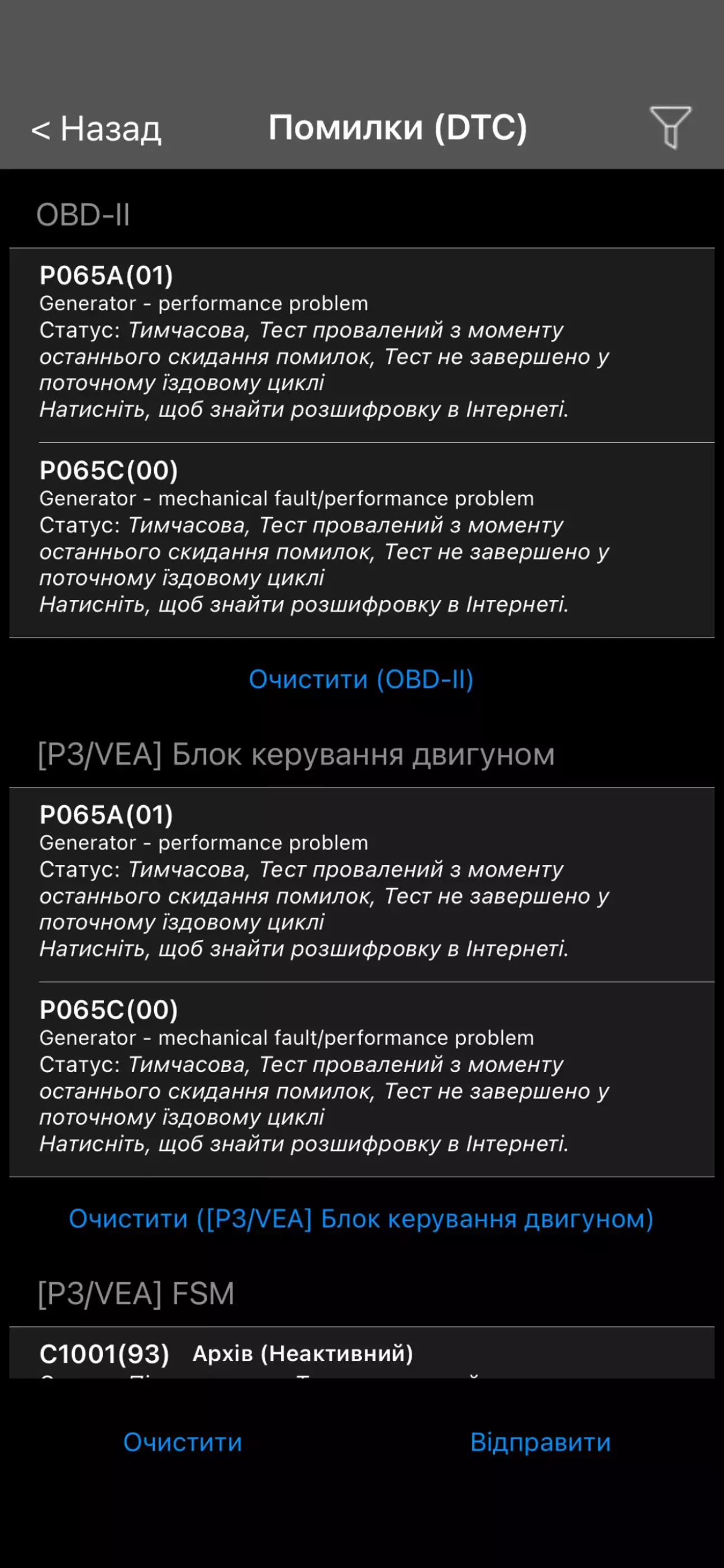 Діагностика на швидку руку видала помилку по «низькій ефективності роботи генератора» ну і напруга борт мережі 10.9В говорила сама за себе - генерації електроенергії немає ) Перевірив на всякий випадок чи часом запобіжники на проводах і силові запобіжники не вигоріли. Там все було добре.