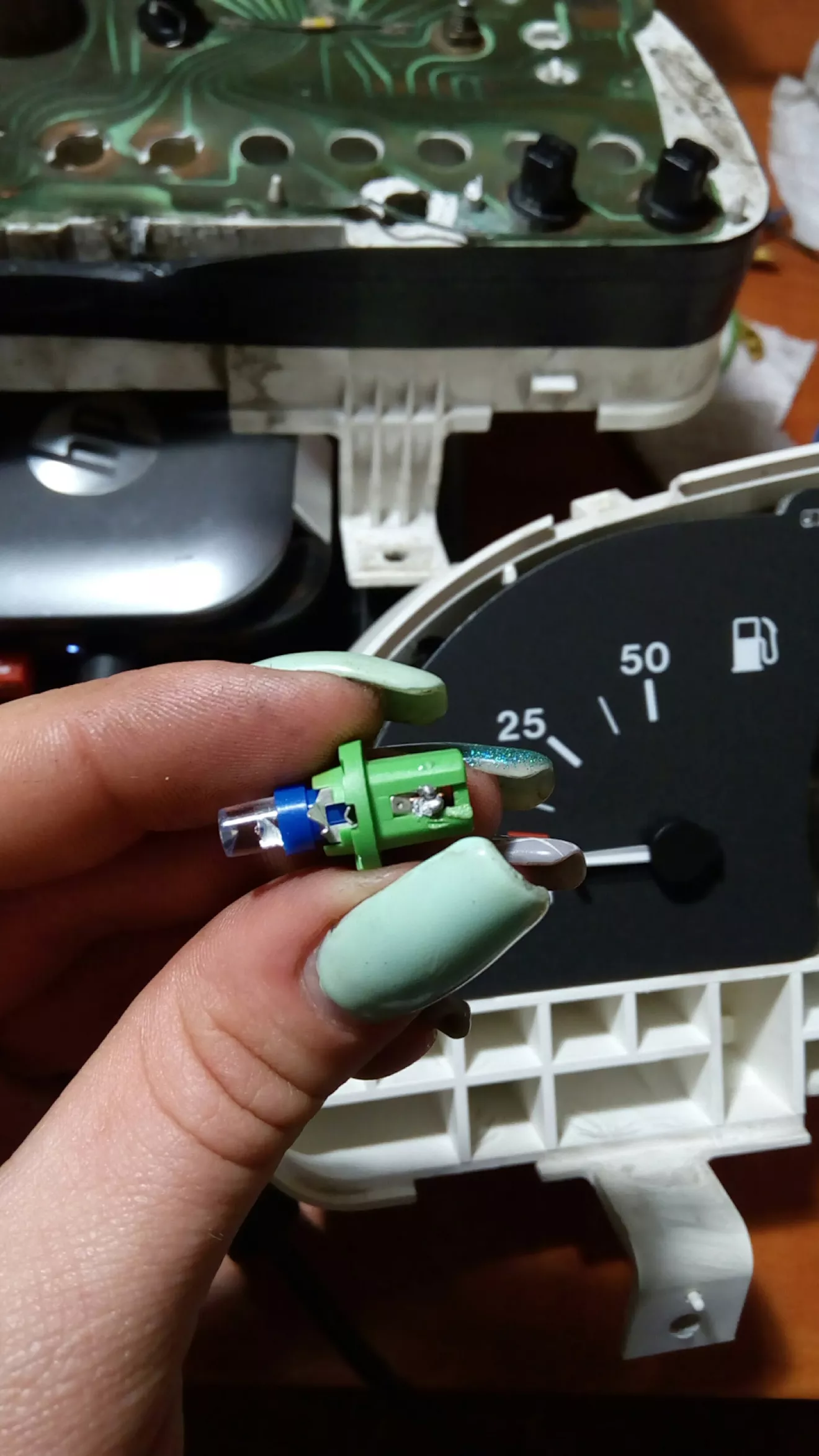 Панель поставила, все работает и радуйся. Нет. Шкалы мне не нравились, да и сломанный коннектор на стяжке тоже не добавлял красоты… Решено было заказать отдельно коннектор, но потом уже вместе с новой панелькой)))