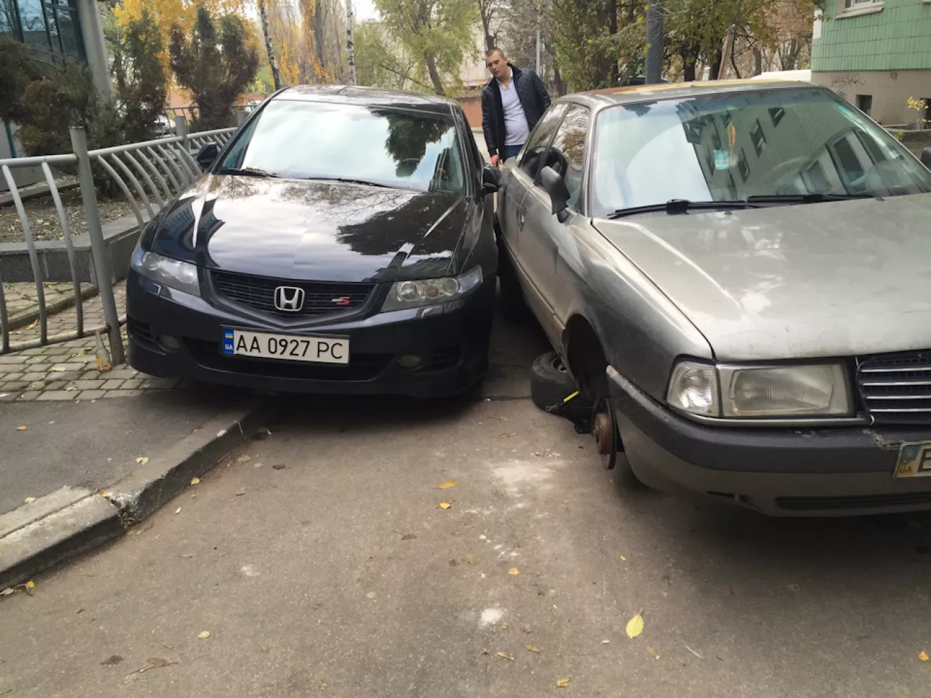Выхожу я как-то утром с братом, а во дворе стоит машина без колеса. И выезд со двора заблокирован. И я в шоке. Потому что я выехать не могу и бросить машину под домом тоже не могу, так как она потом будет всем мешать!