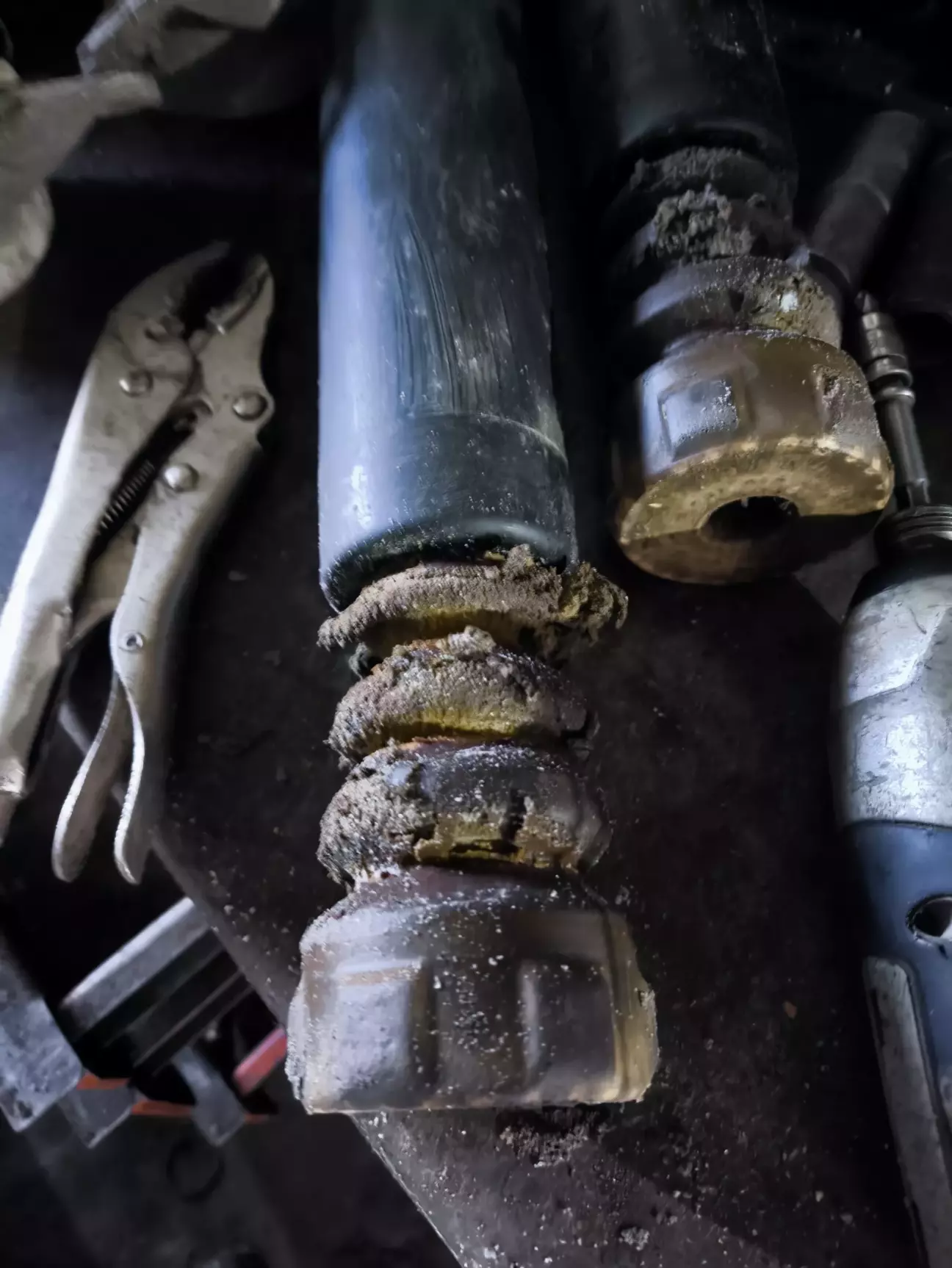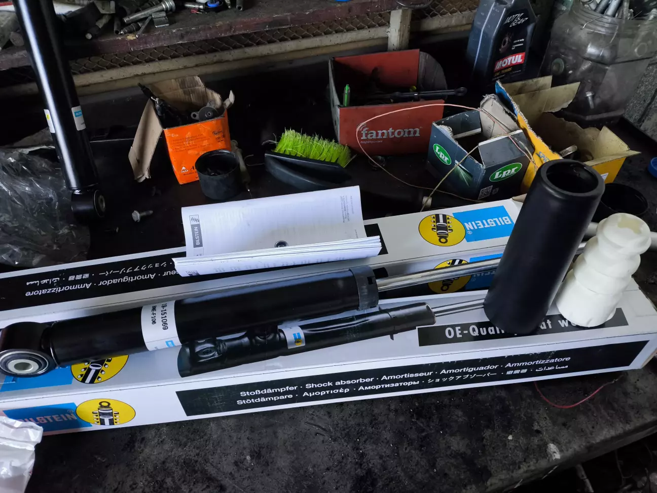 За зиму помітив що зад візуально значно сів відносно переду через це почав тертись пузом на снігу , сьогодні поїхав купив комплект амортизаторів Bilstein + відбійники/пильники на обидві сторони Febi Bilstein. Що те що те Made in Germany. Побачимо як буде ходити. Старі амортизатори вмерли просто, фото додаю , не відкидає наглухо. Відбійники теж посипались.