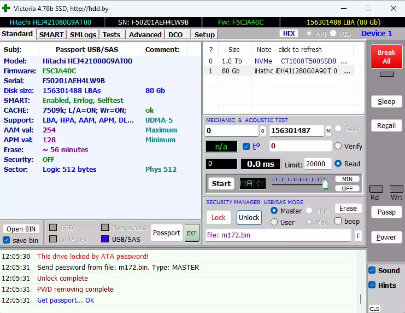 Victoria 4.76b SSD: Саме ця стара версія коректно "прокидає" ATA-команди розблокування через китайські USB-мости (наприклад, Fideco).