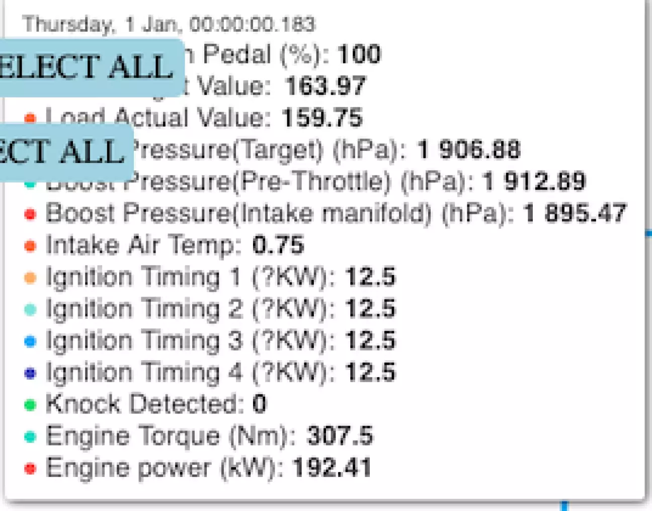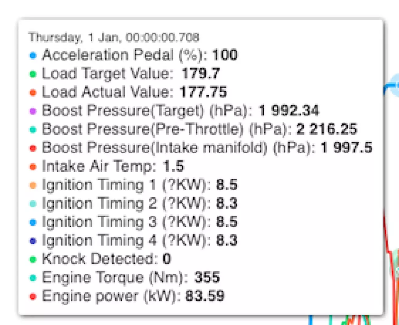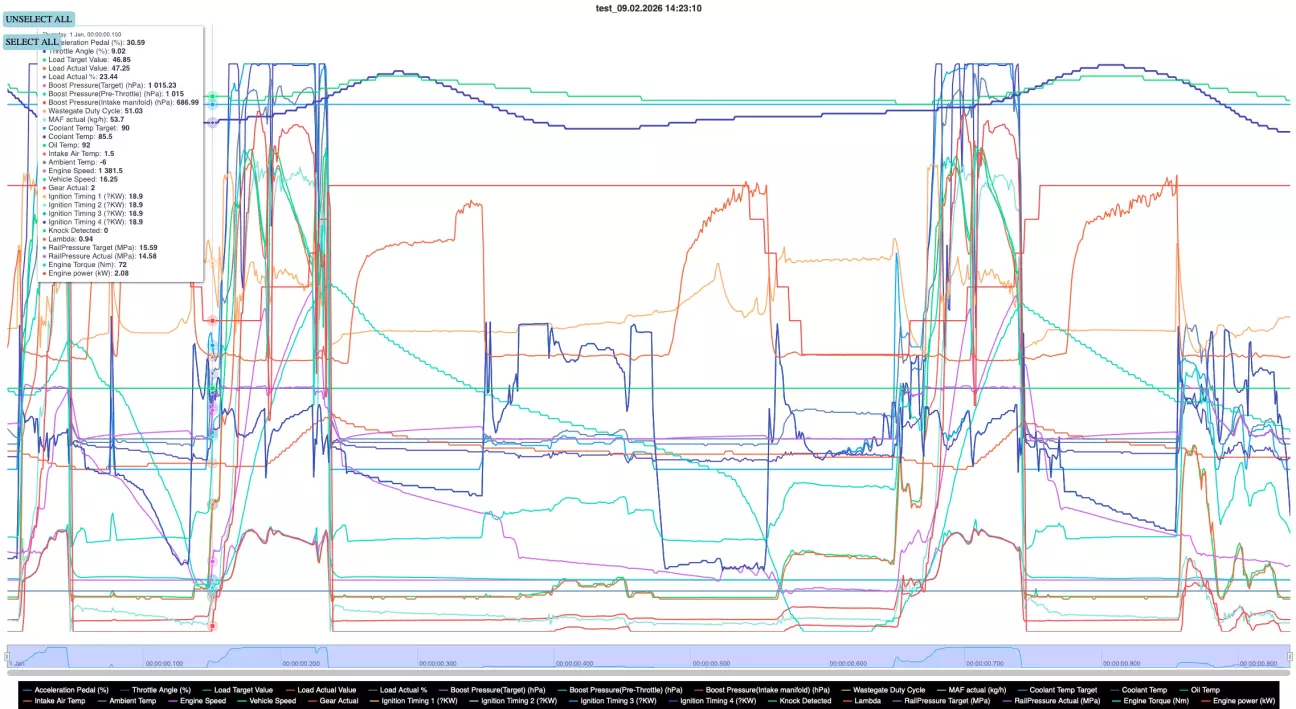 Судячи з логів у всіх діапазонах роботи двигуна, він повністю працює справно. Заданий і фактичний буст повністю відповідають один одному, тиск у паливній рампі відмінний, що свідчить про повністю справний ТНВД. Детонації немає, а кути запалювання ідеальні.