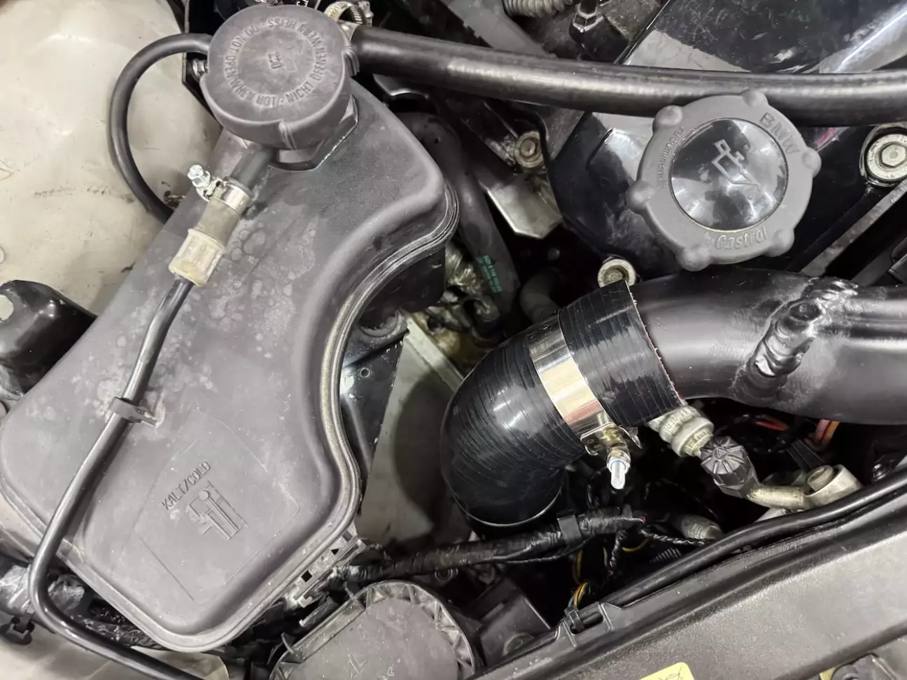 Тому вирішив перенести її трохи далі на стакан (там вже була різьбова шпилька + більше тепла від випускного колектора, а значить менший шанс що вміст тієї банки замерзне). Спочатку прокинув шланг через верх, не подумавши про декоративну кришку (на той час я чомусь був впевнений що вона не встане через новий впускний колектор):