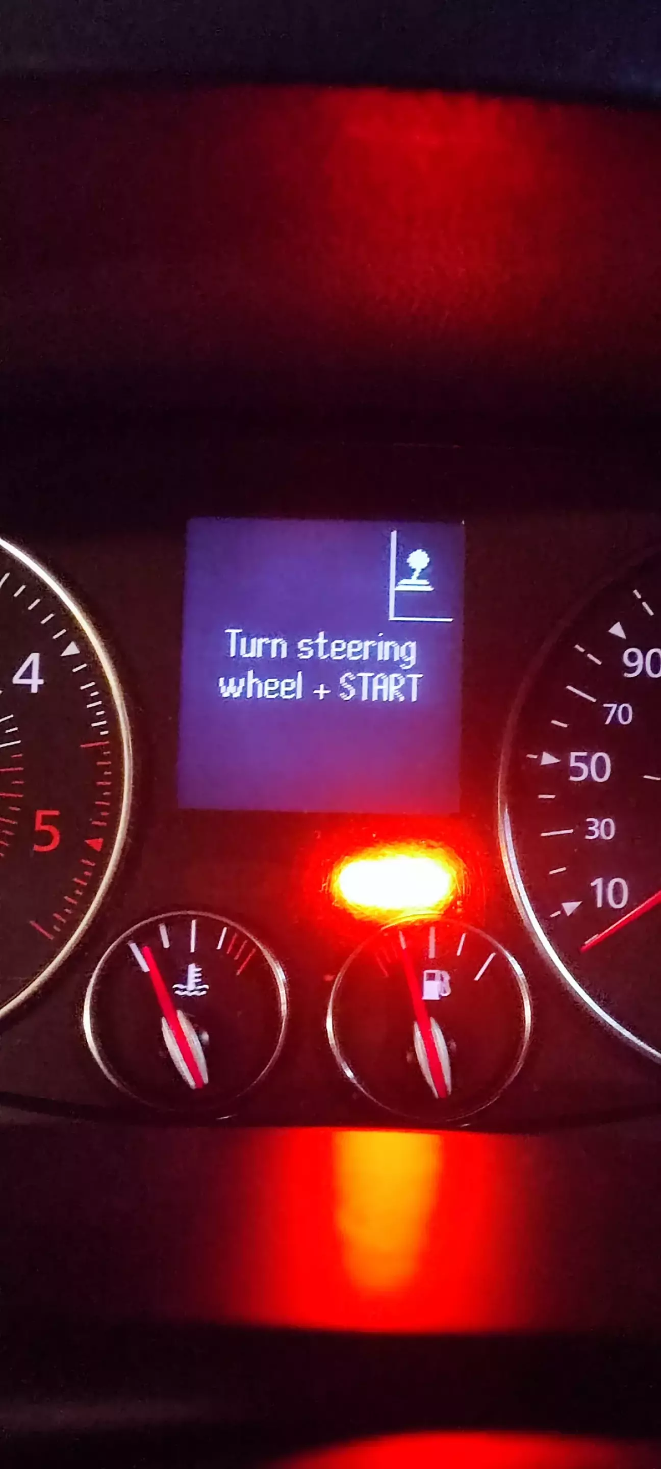 "Глюк якийсь", - подумав я, "мабуть якось криво кермо поставив, от і не спрацював замок". Але спроби заглушити авто не мали успіху. Декілька кортких натискань і все ж заглохла, але тепер не запускалась, а звичний напис "натисніть гальма + старт" змінився на "поверніть кермо + старт" і авто більше ніяк не реагувало на кнопку пуск.